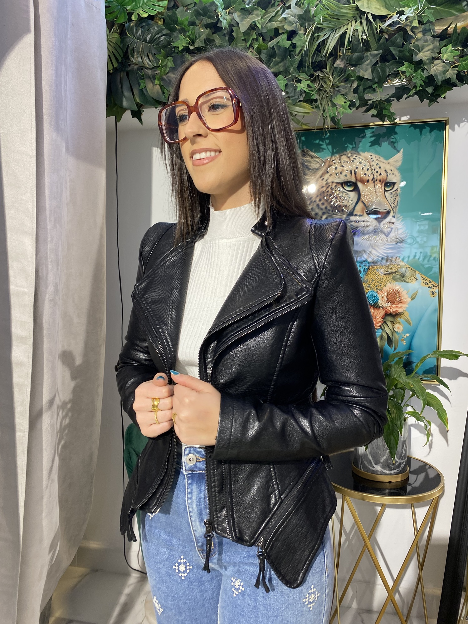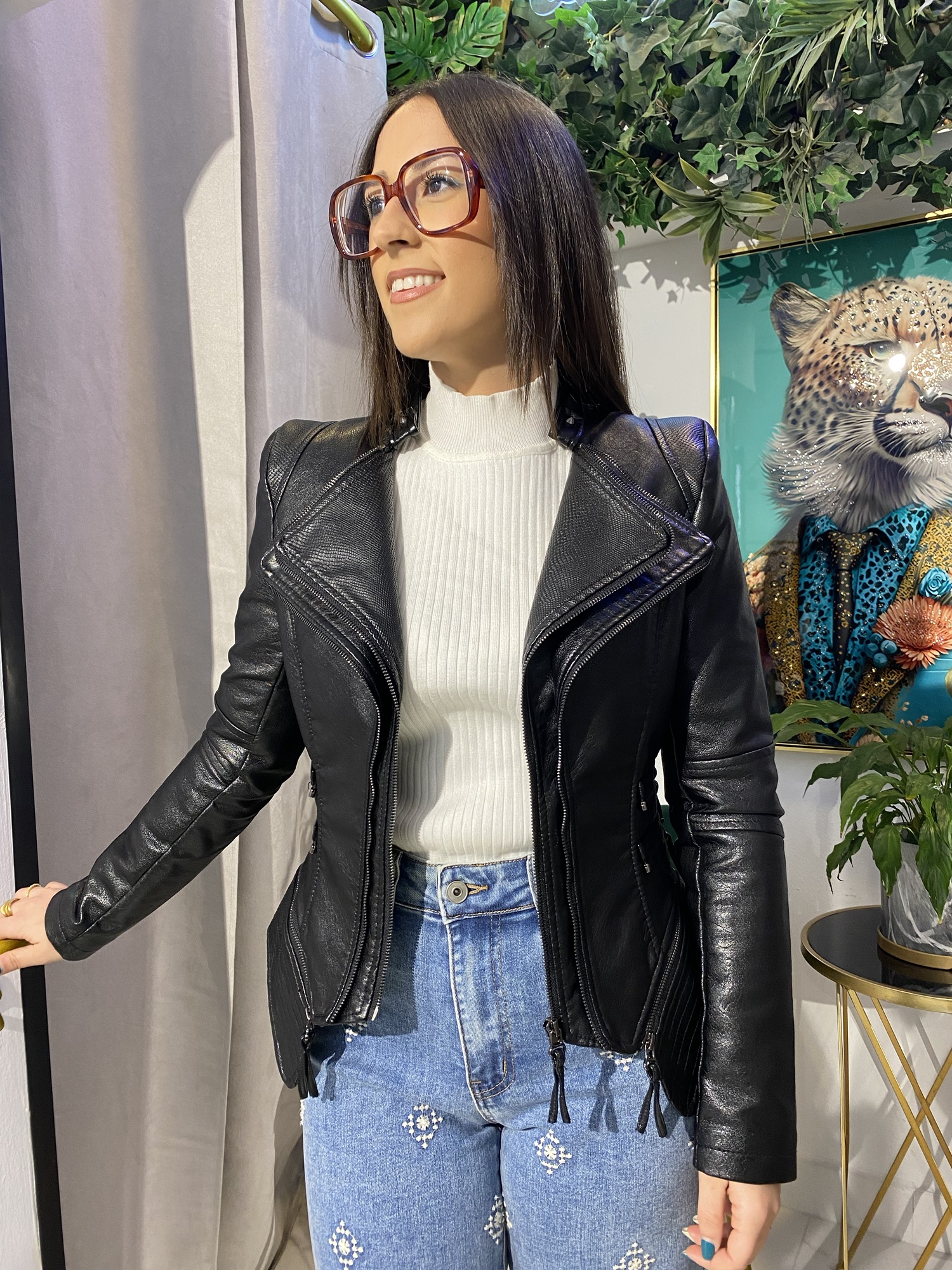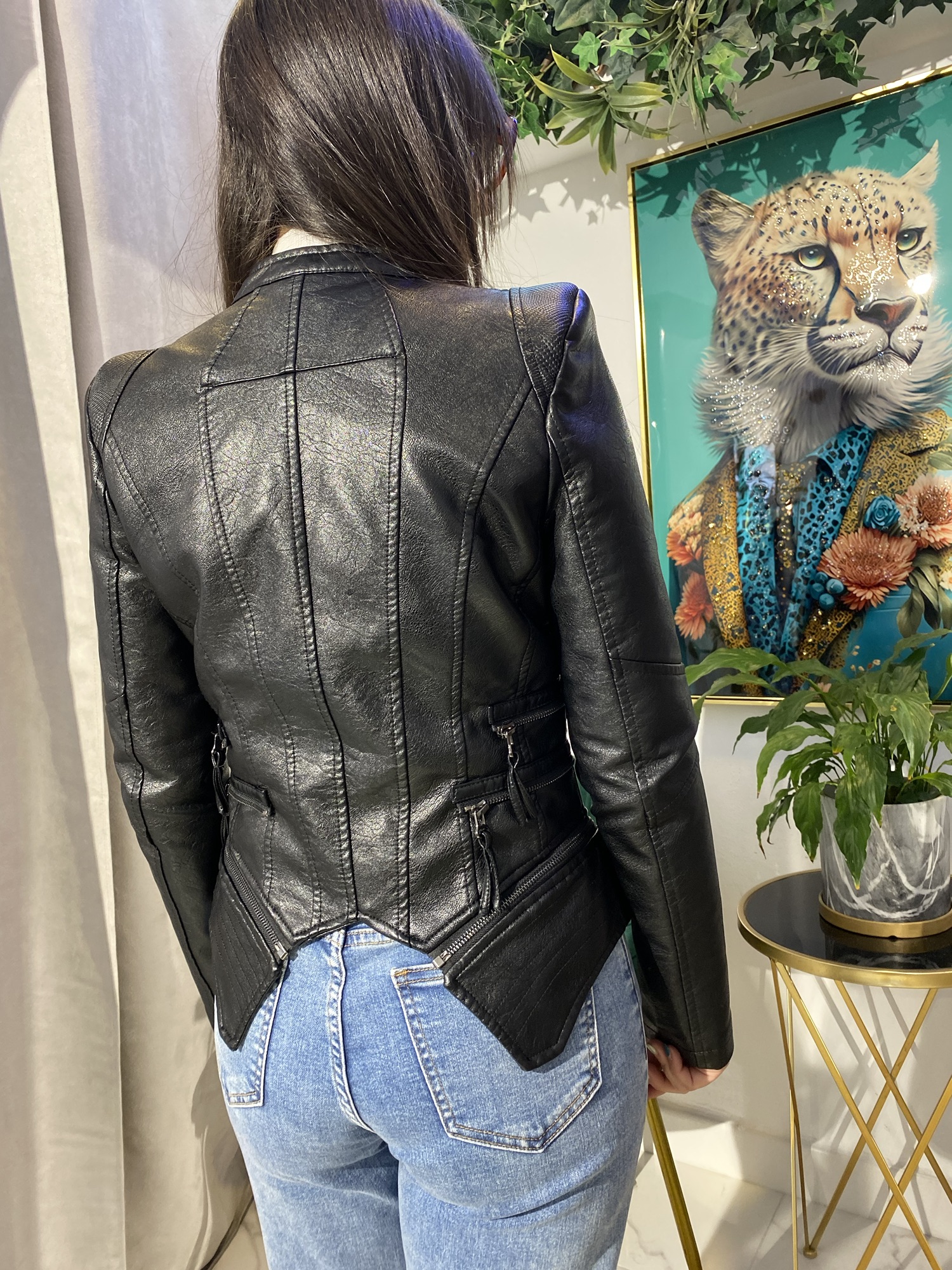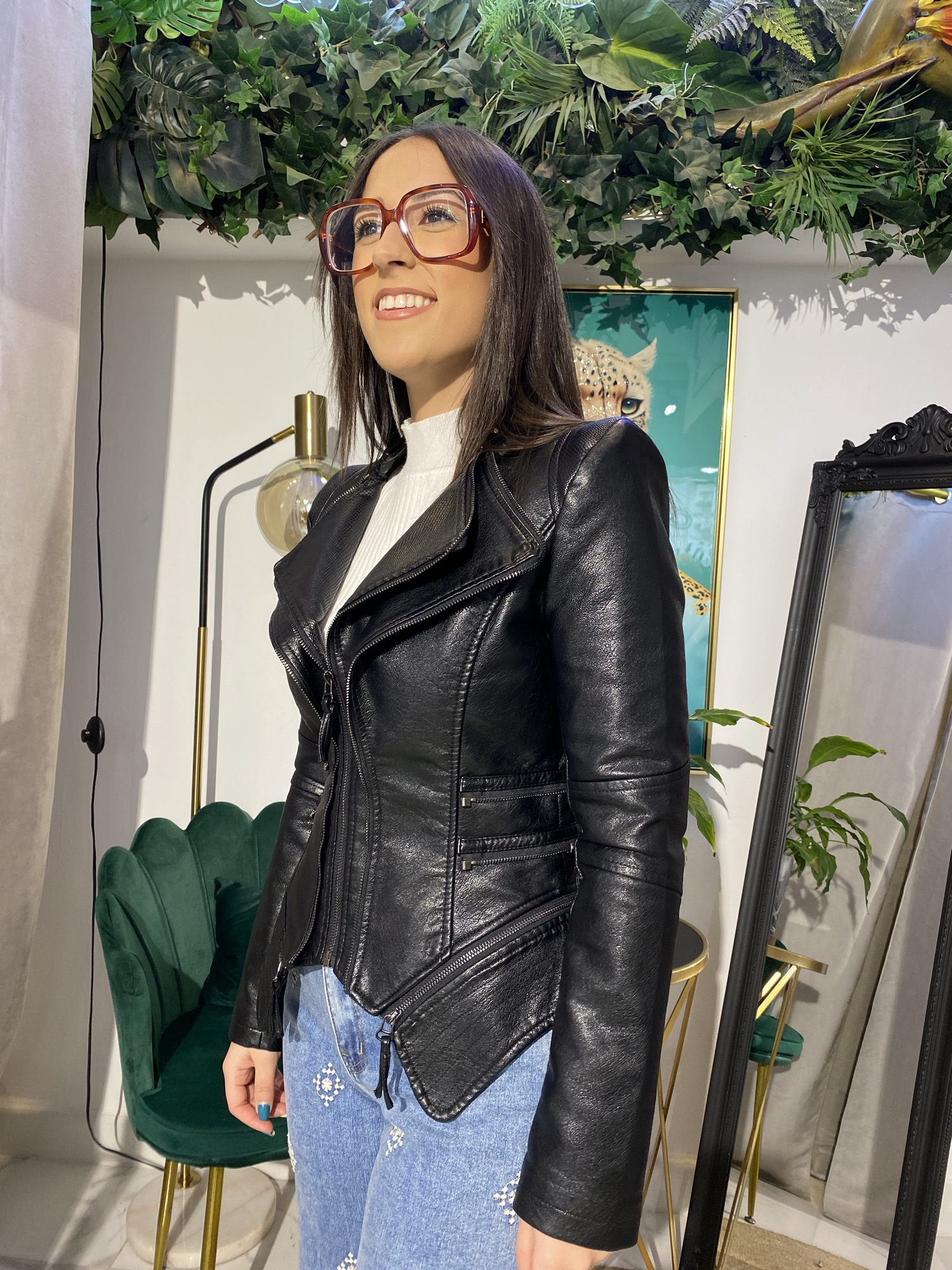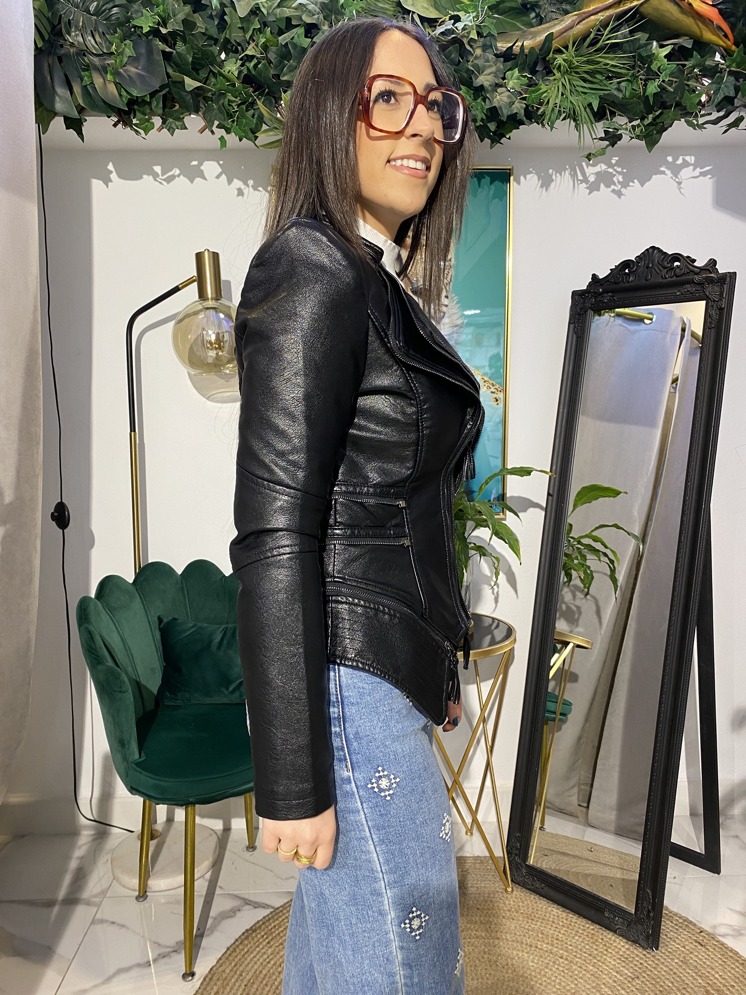 Confeccionada en polipiel de alta calidad, esta chaqueta destaca por su diseño corto y entallado que realza la figura. Desmontable en los laterales ofrecen la posibilidad de llevarla con un look más clásico o más moderno, adaptándose a tus preferencias la hacen una prenda cómoda y funcional que podrás usar tanto en ocasiones informales como en tu día a día.