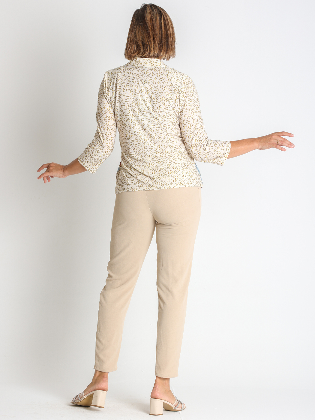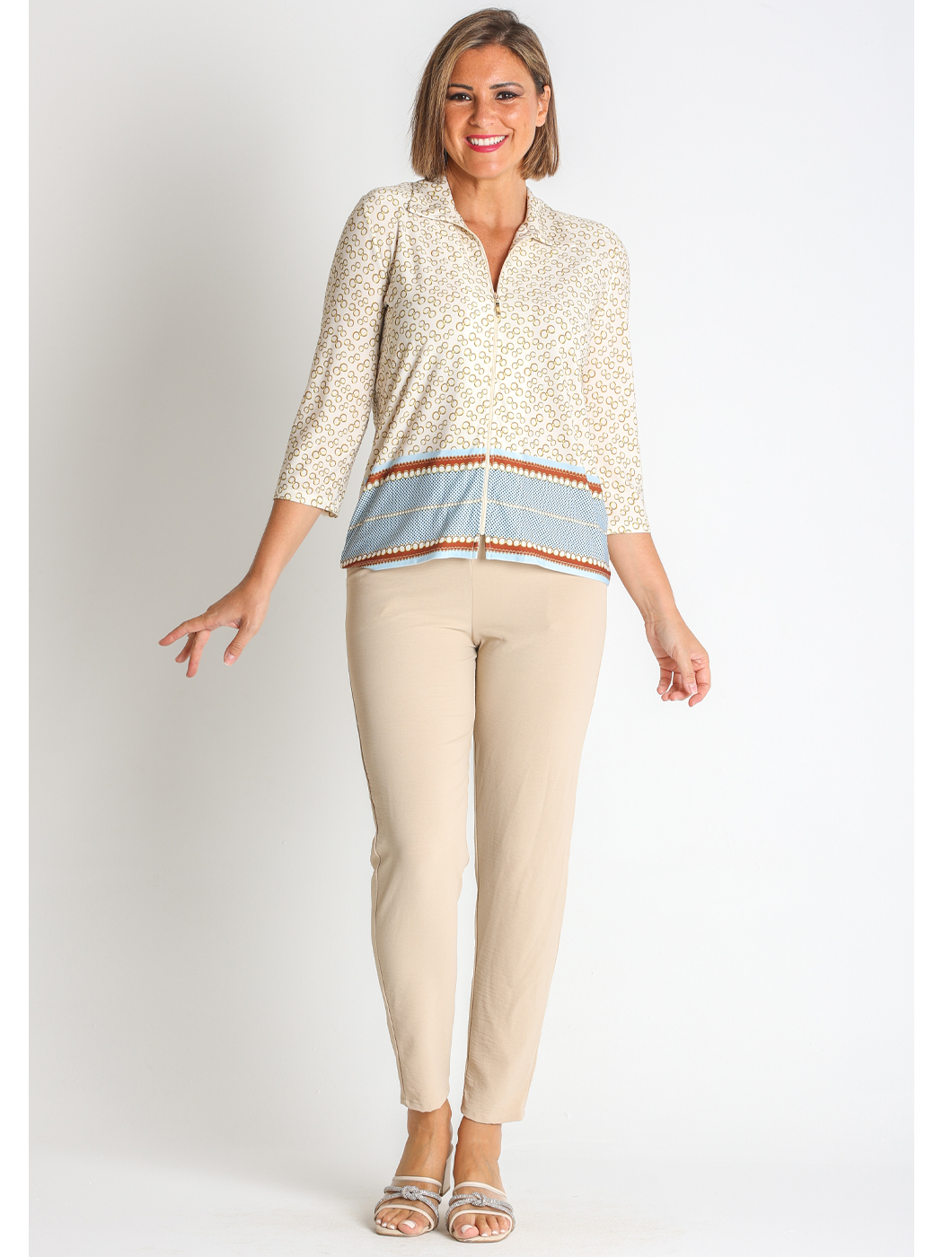 Chaqueta fabricada en punto estampado; tejido fluido, elástico y muy cómodo.