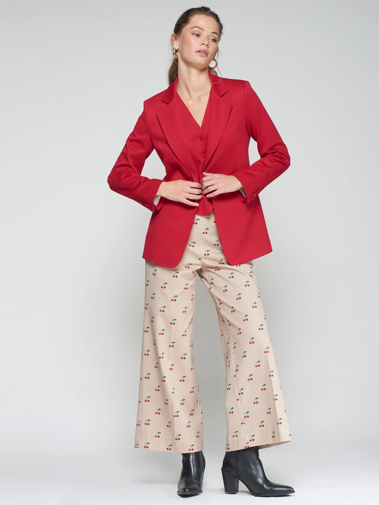 Chaqueta de color rojo con cierre frontal de un botón y botones forrados también en los puños. Solapa clásica con pespunte decorativo. Corte recto ligeramente entallado. Lleva forro interior estampado. Forma parte de un conjunto con chaleco y pantalón del mismo tejido.
