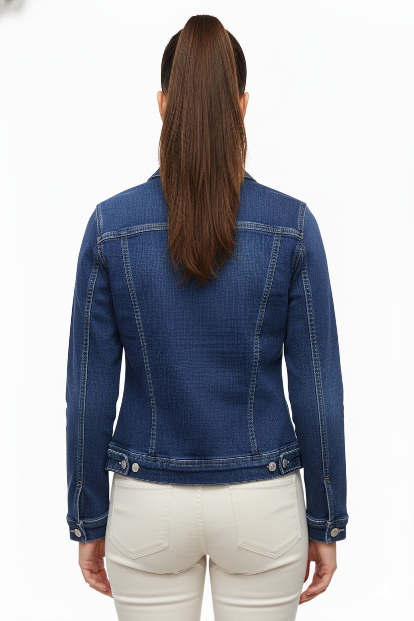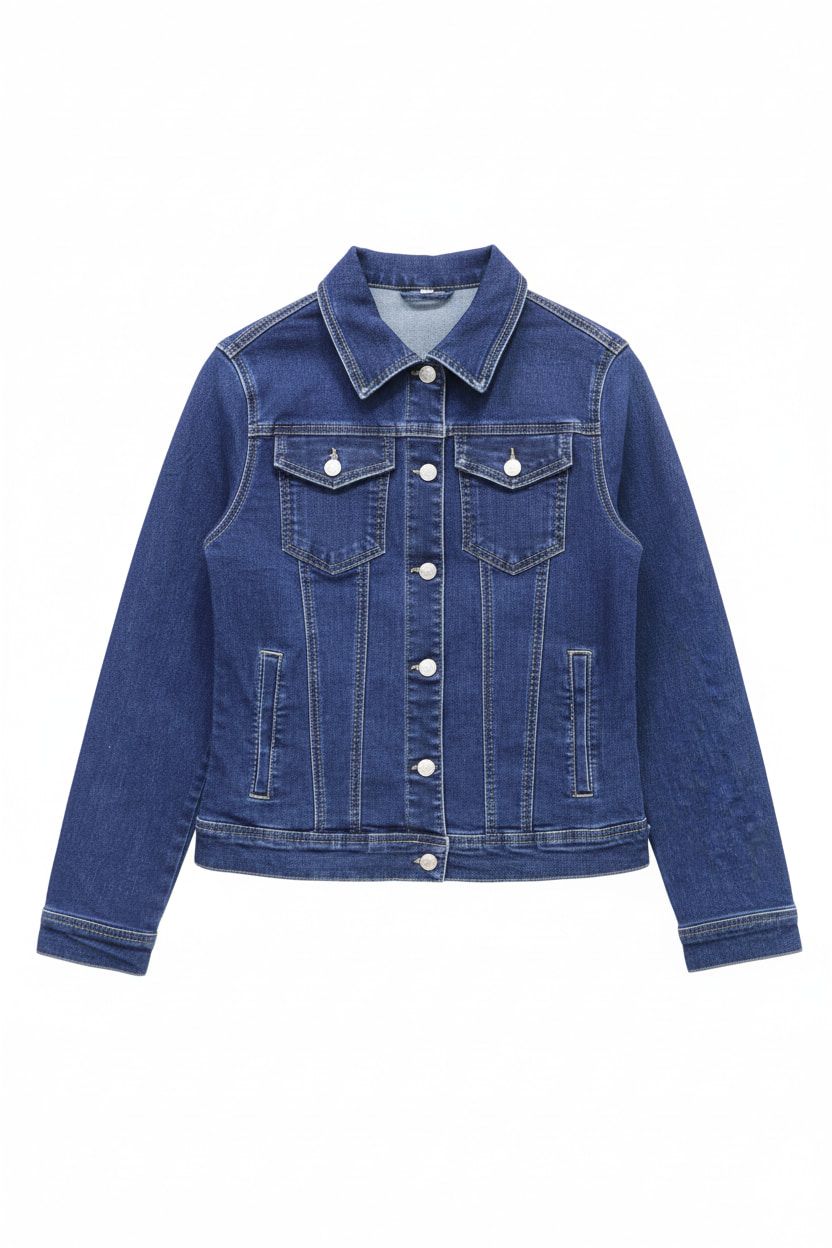 Chaqueta casual vaquera con botones metálicos y detalles de costura. Presenta un diseño clásico con cuello, bolsillos frontales con solapa y bolsillos laterales discretos, ideal para un estilo versátil y atemporal, adaptándose a diversas ocasiones.