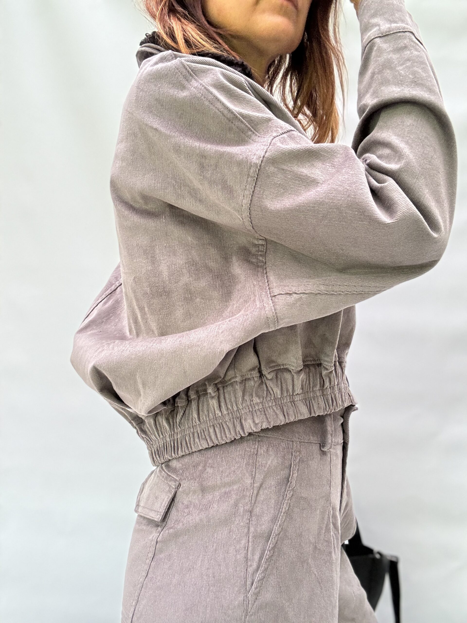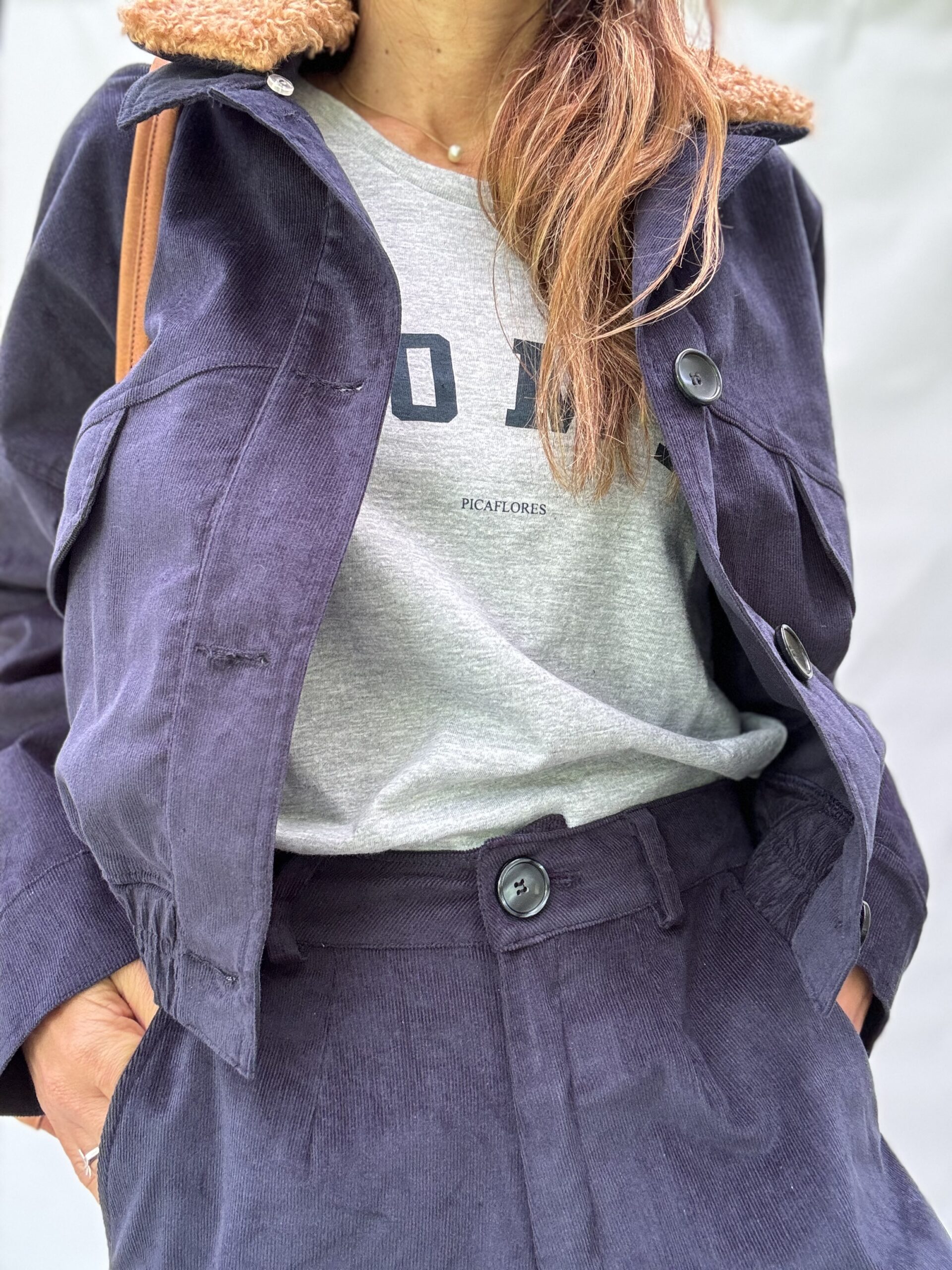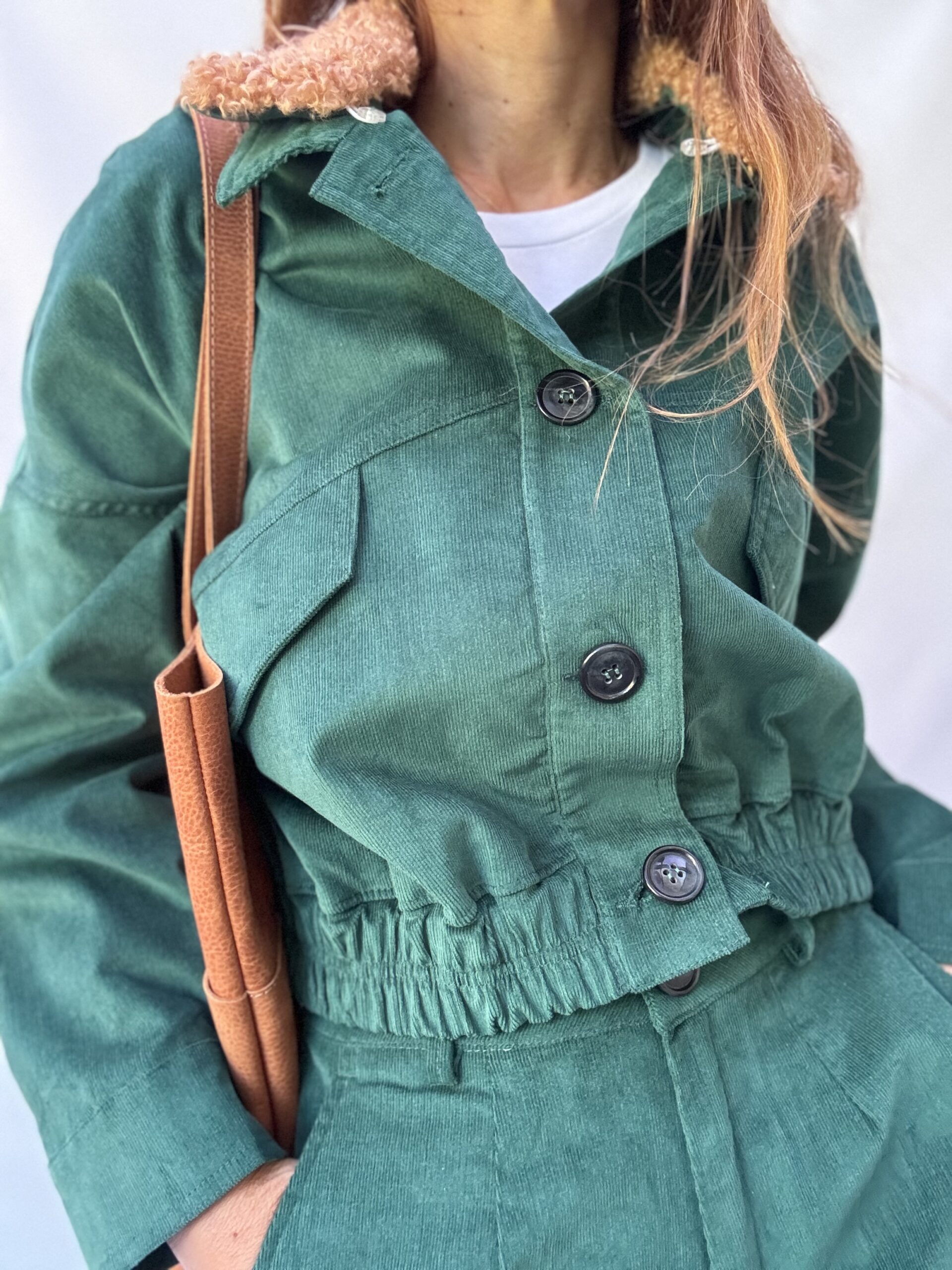 -Chaqueta Viena: confeccionada en corderoy sutilmente elastizado, modelo oversized, cuello desmontable en buclé. Los bolsillos del frente tienen tapa. La cintura elastizada realza su silueta. Talle único