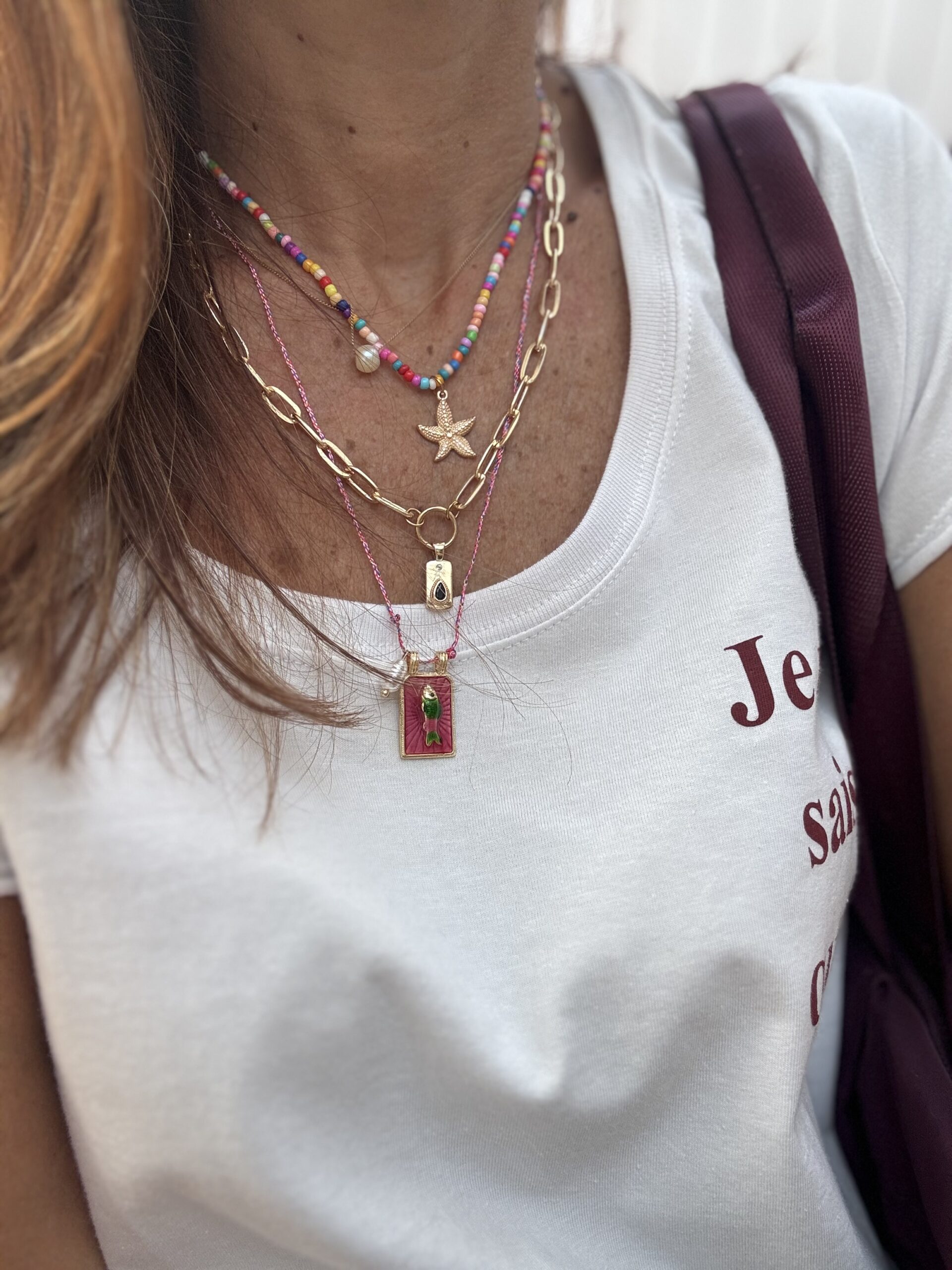 La combinación de los distintos colgantes le da una onda veranil, fresca y moderna.
