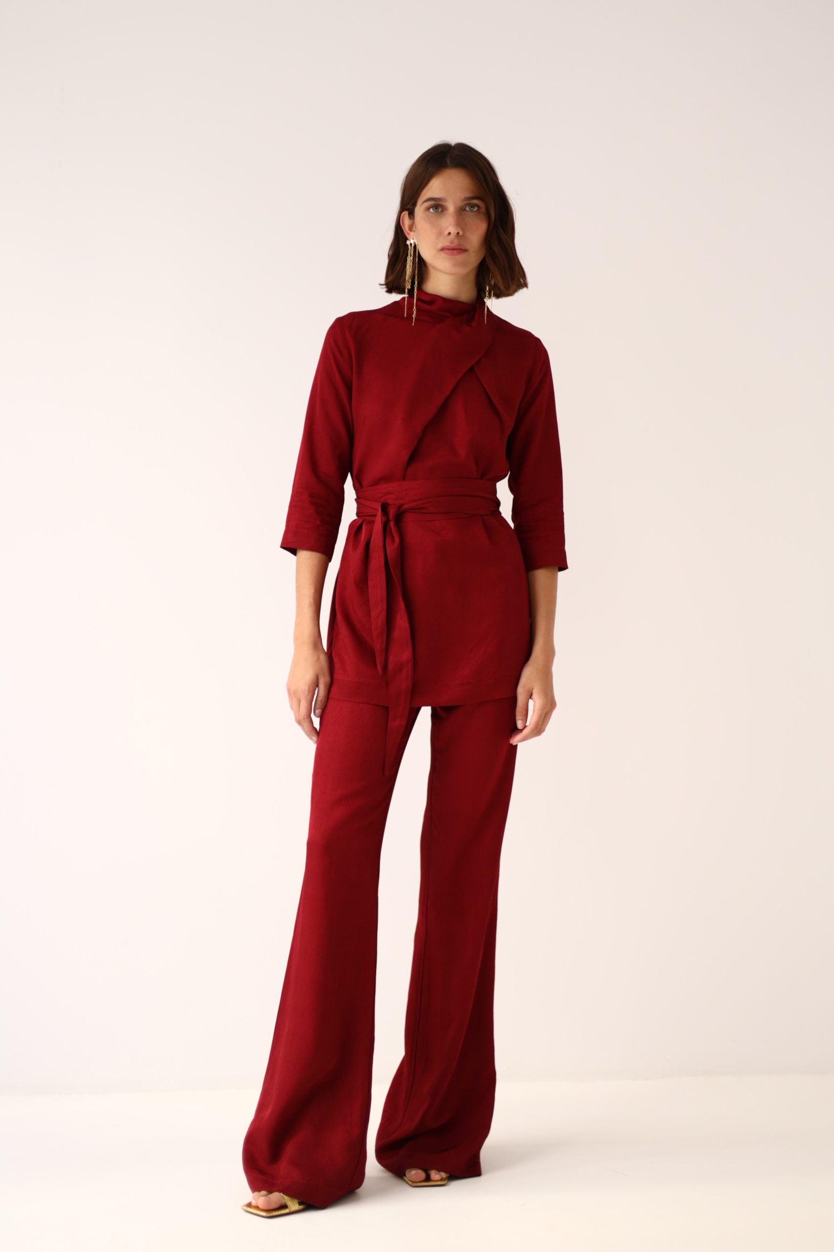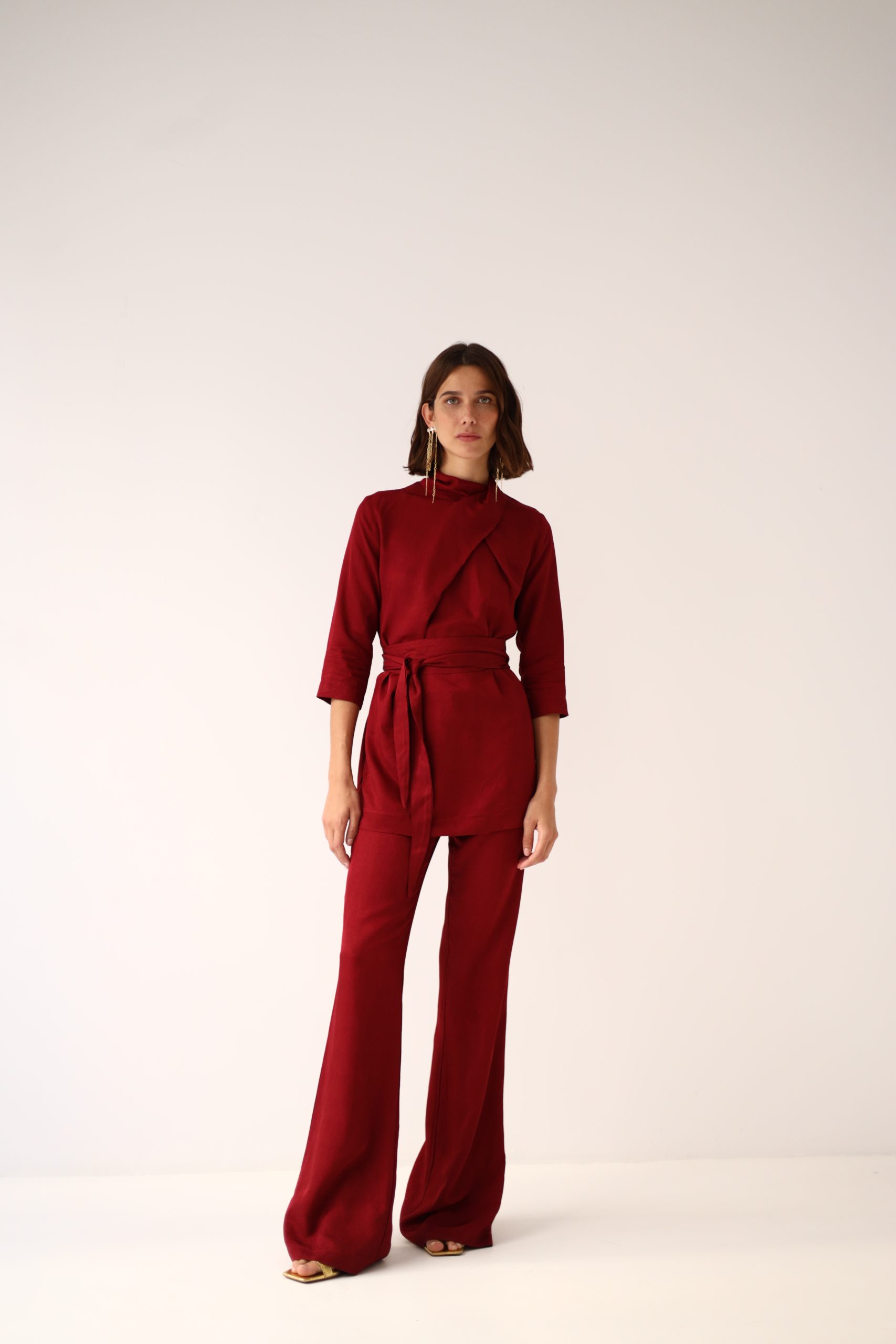 Conjunto de camisa y pantalón estilo setenta, con estampado jacquard en color vino.