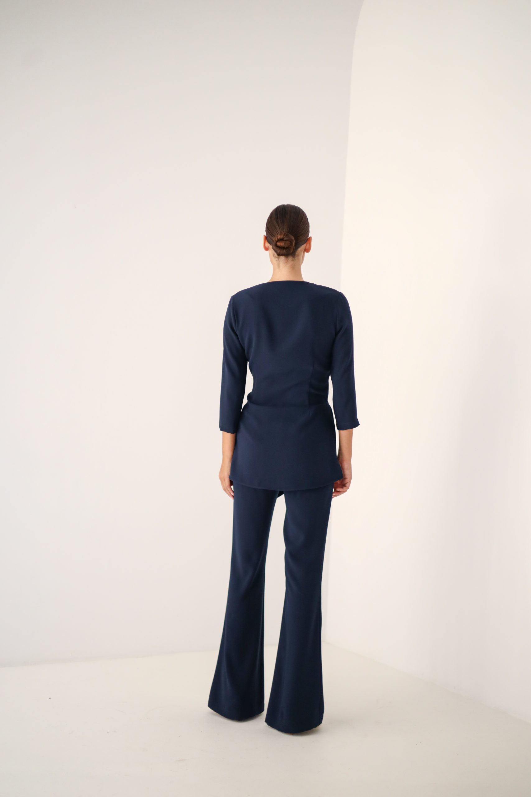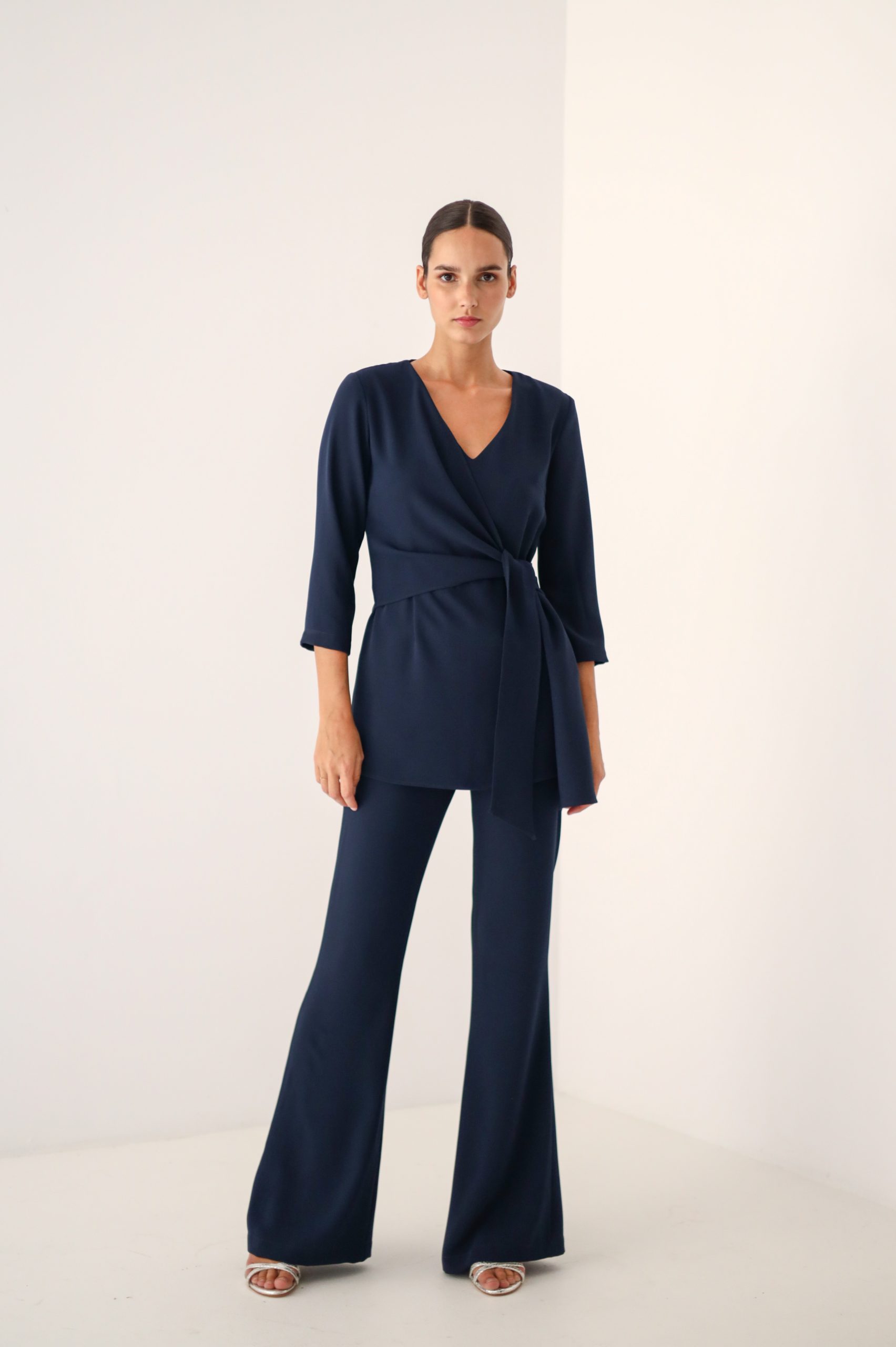 Conjunto exclusivo de la colección By Biombo de camisa y pantalón en crepe color azul marino.