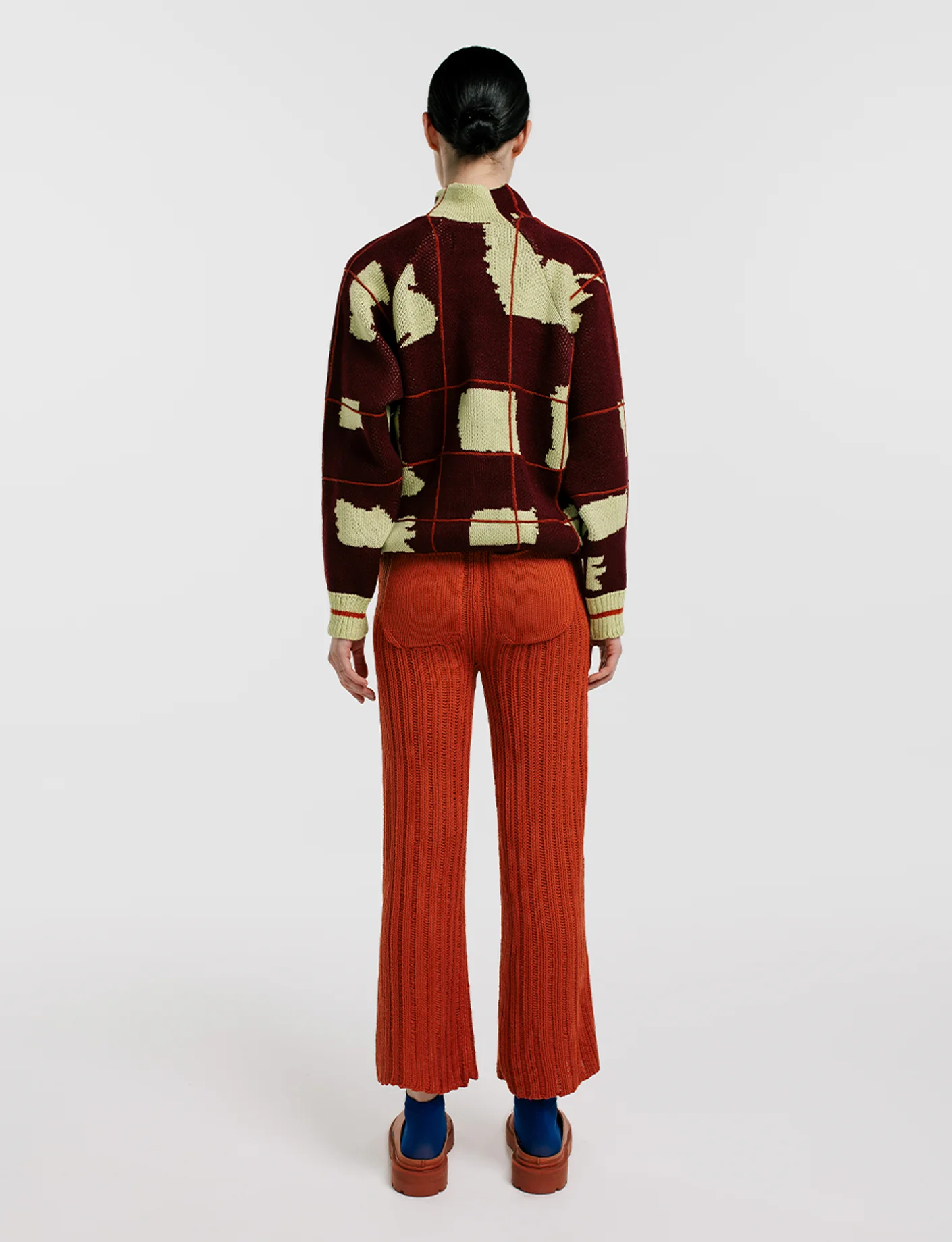 Sweater tejido con patrón tipo tartán en tonos verdes. Tonos de verde y vinotinto. Silueta regular. Patrón diseñado y tejido en máquina. Hecho en Sogamoso, Boyacá, Colombia.