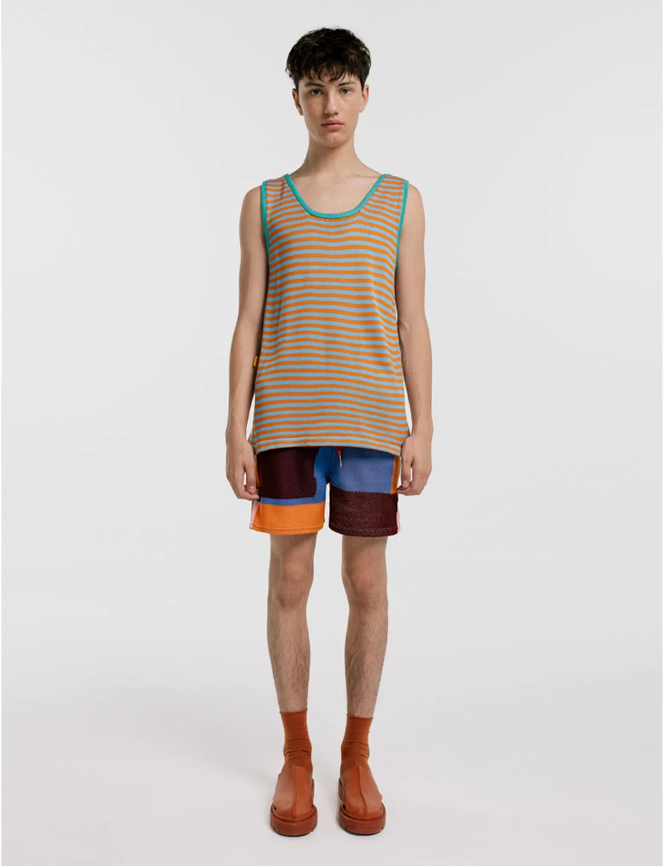 Tank top cuello redondo en Hilo en print verano en color naranja y aguamarina. Tejido ligero hecho en telar artesanal, terminado y bordado a mano. Hecho en Sogamoso, Boyacá, Colombia.