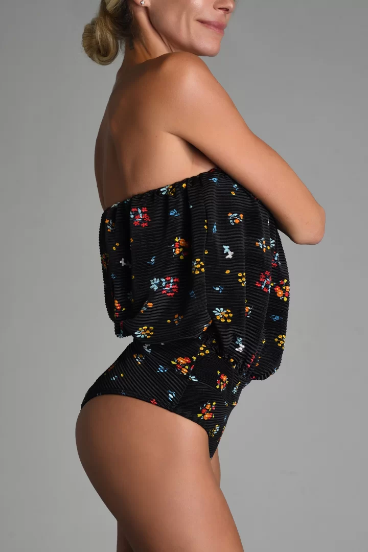Traje de baño enterizo, en LUREX BRILLOSO, abuchonada a la cintura, con corpiño interno con bolsillo para relleno o taza. Incluye breteles removibles al tono.