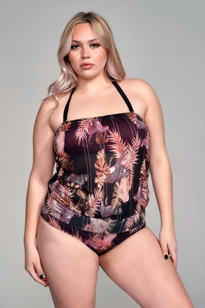 Traje de baño enterizo, traslúcida, abuchonada a la cintura, con corpiño interno con bolsillo para relleno o taza. Incluye breteles removibles al tono.
