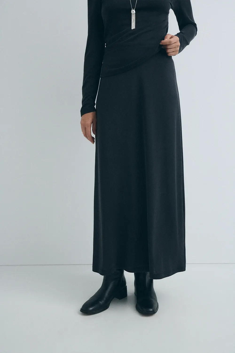 Falda larga fluida. Cinturilla con goma interior. Tejido elástico. Sin cierre. Calidad del tejido tipo cupro.