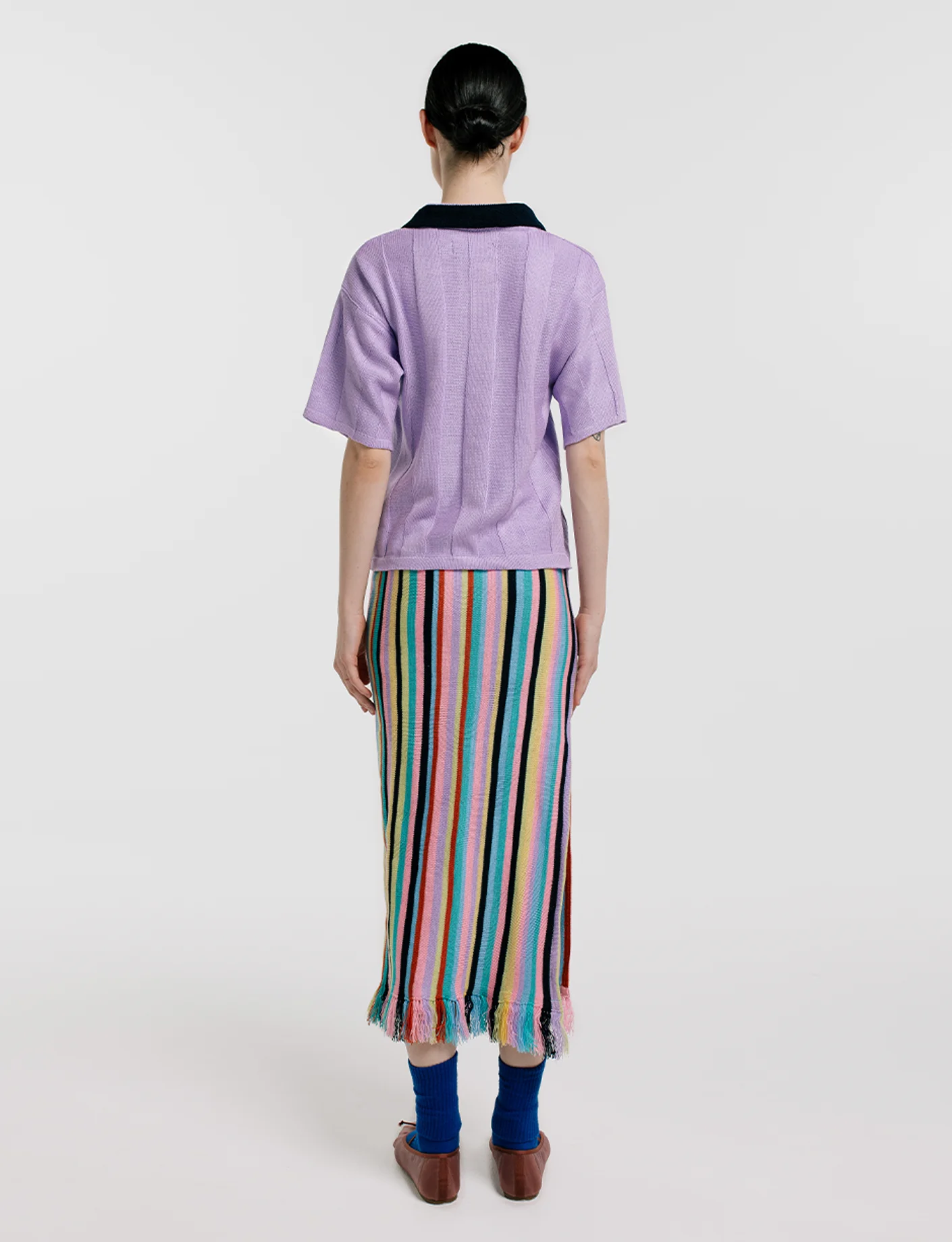 Falda larga tejida en Hilo Hipoalergénico con print de líneas verticales, terminada con detalle de flecos en el bajo. Fit recto. Tejido de punto, terminada y bordada a mano. Hecha artesanalmente en Sogamoso, Boyacá. Disponibilidad en todas las tallas.