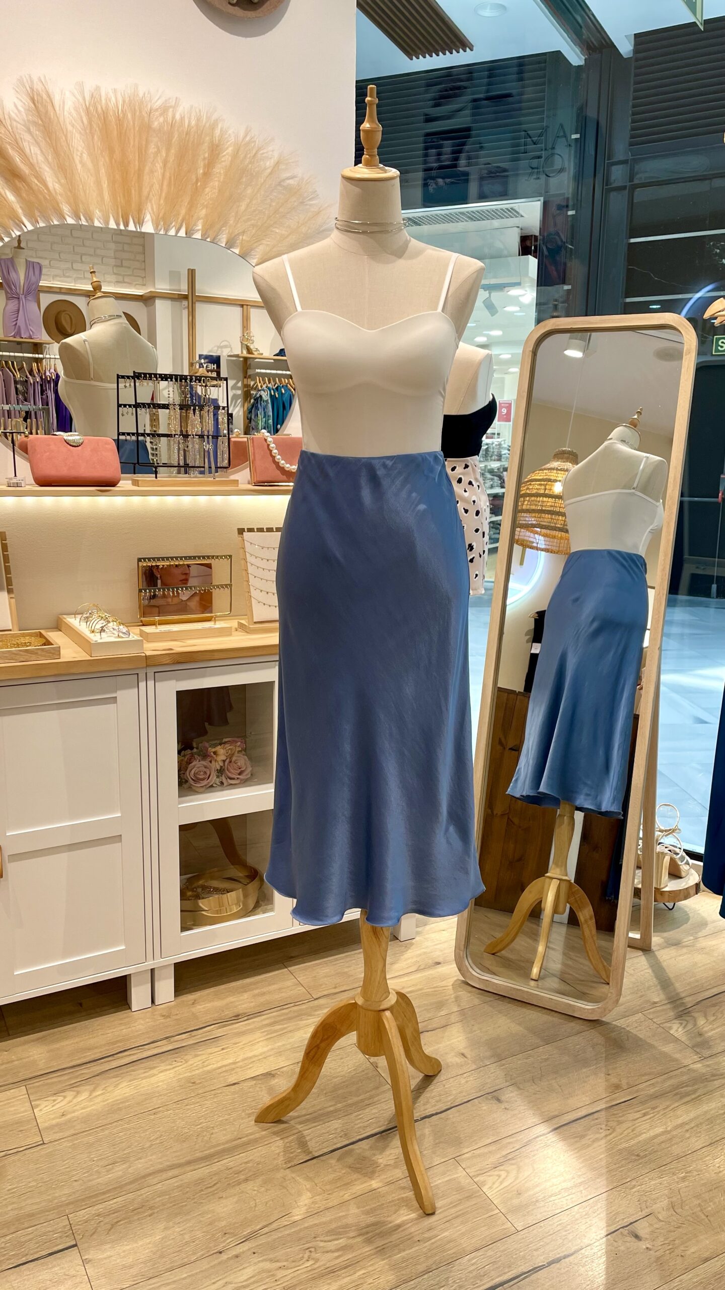 Falda de tejido tipo raso con goma en la cintura, color azul cielo de corte midi, ideal para convertirte en la invitada perfecta y crear looks con mucho estilo, te encantará lo cómoda que es.