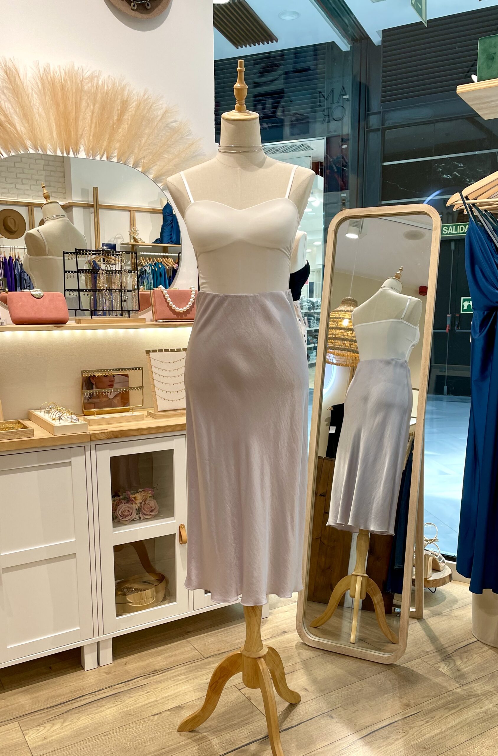 Falda de tejido tipo raso con goma en la cintura, color gris perla de corte midi, ideal para convertirte en la invitada perfecta y crear looks con mucho estilo, te encantará lo cómoda que es.