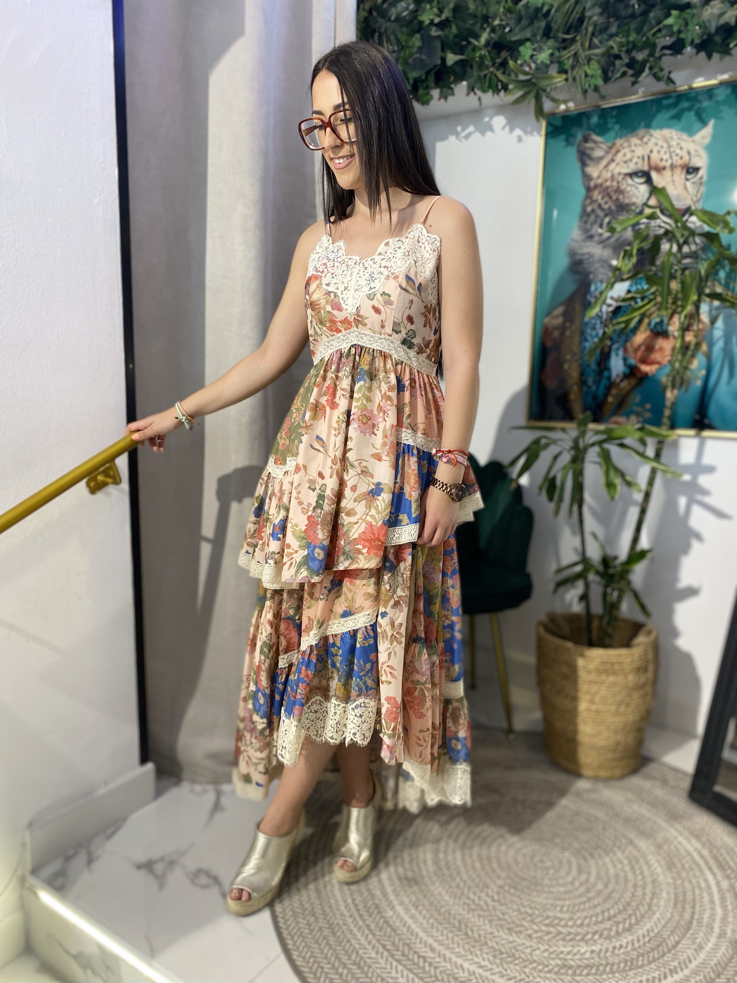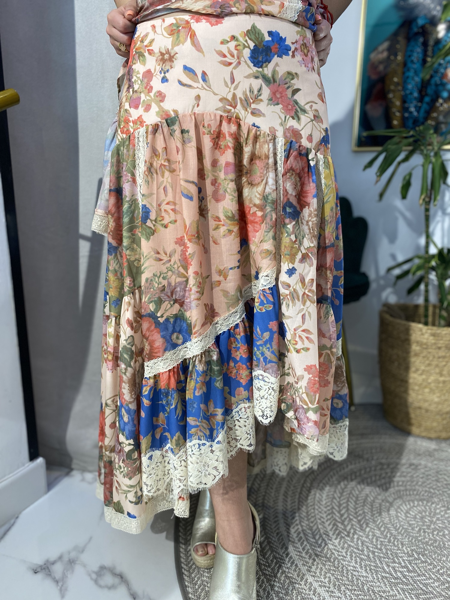 Esta falda es la definición del estilo bohemio-chic. Su corte asimétrico crea una silueta dinámica y moderna, mientras que el estampado vibrante añade un toque artístico. El delicado encaje en el bajo eleva la prenda, aportando una dosis de sofisticación y feminidad. Perfecta para un look distintivo y lleno de personalidad.