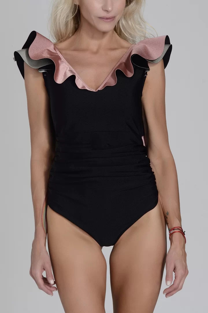 Traje de baño enterizo escote V con volados rígidos en combinación de colores, NEGRO/ROSA/PLATA (BRILLOSOS) espalda baja, drapeado en el abdomen y bombacha vedetina.