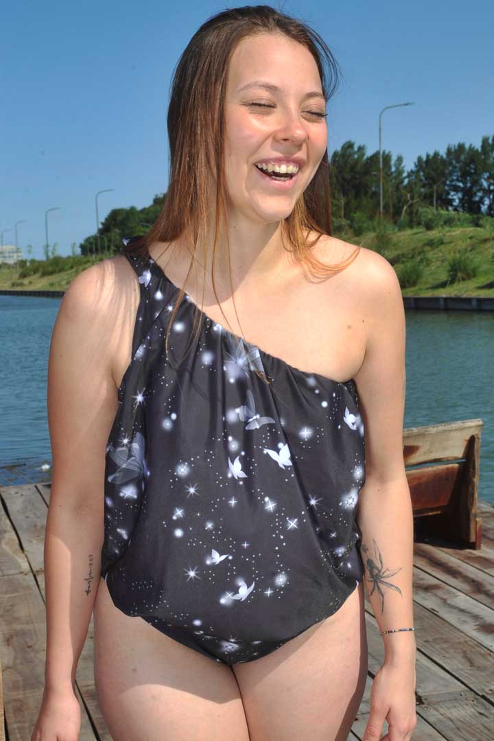 Malla enteriza estampada. Asimétrica con buche, faja y corpiño interno con bolsillo para relleno o taza y bombacha vedetina.