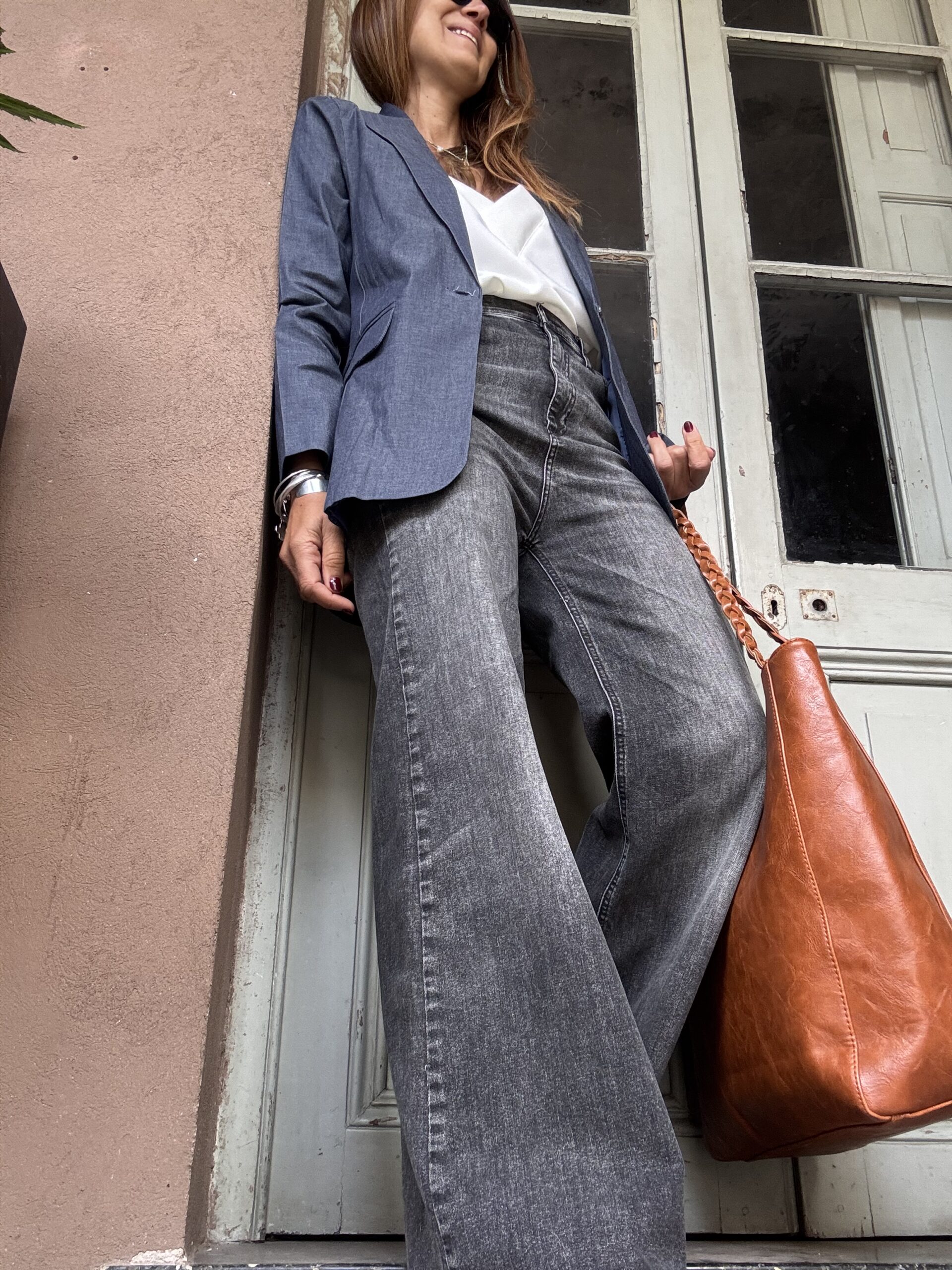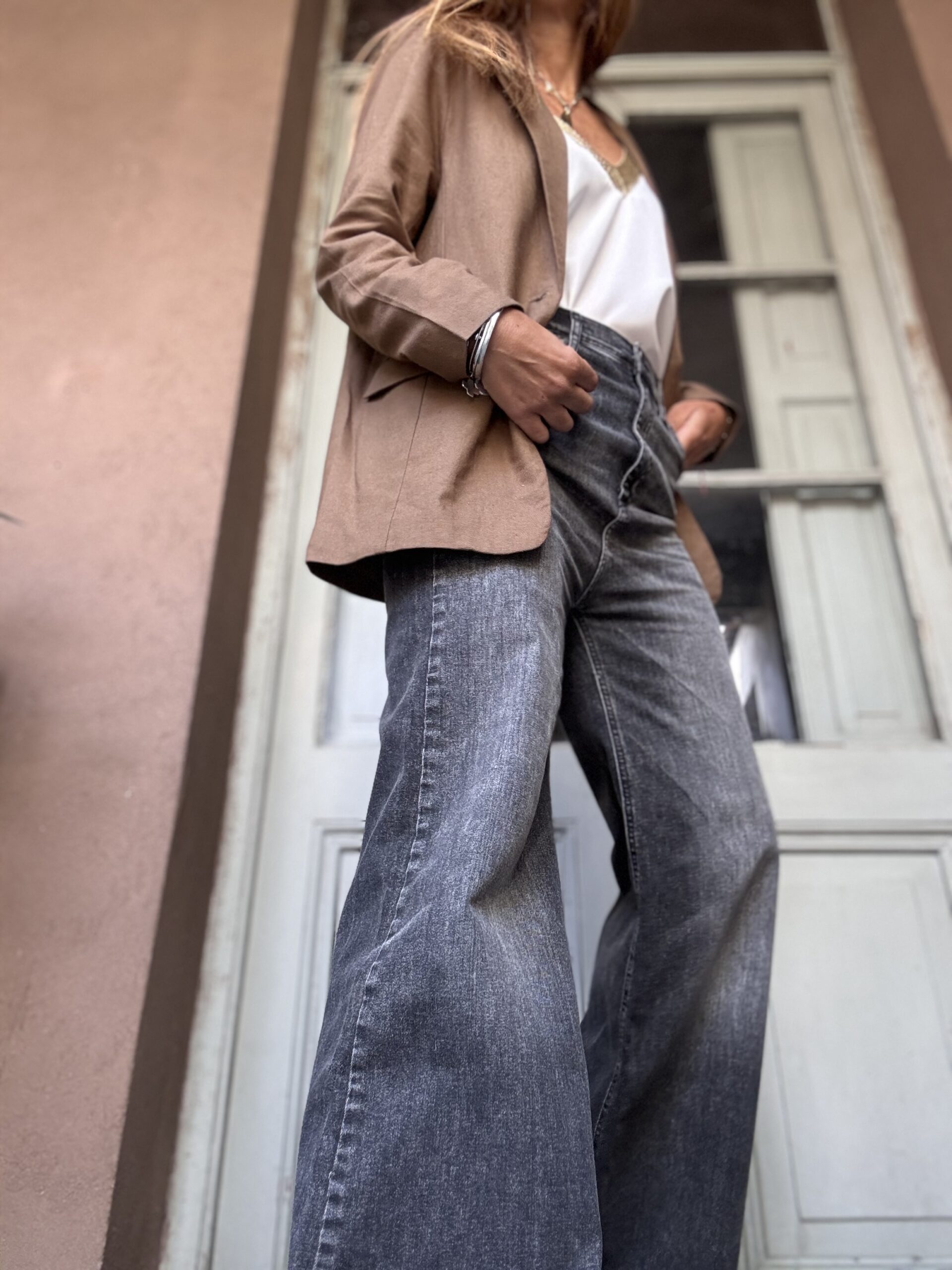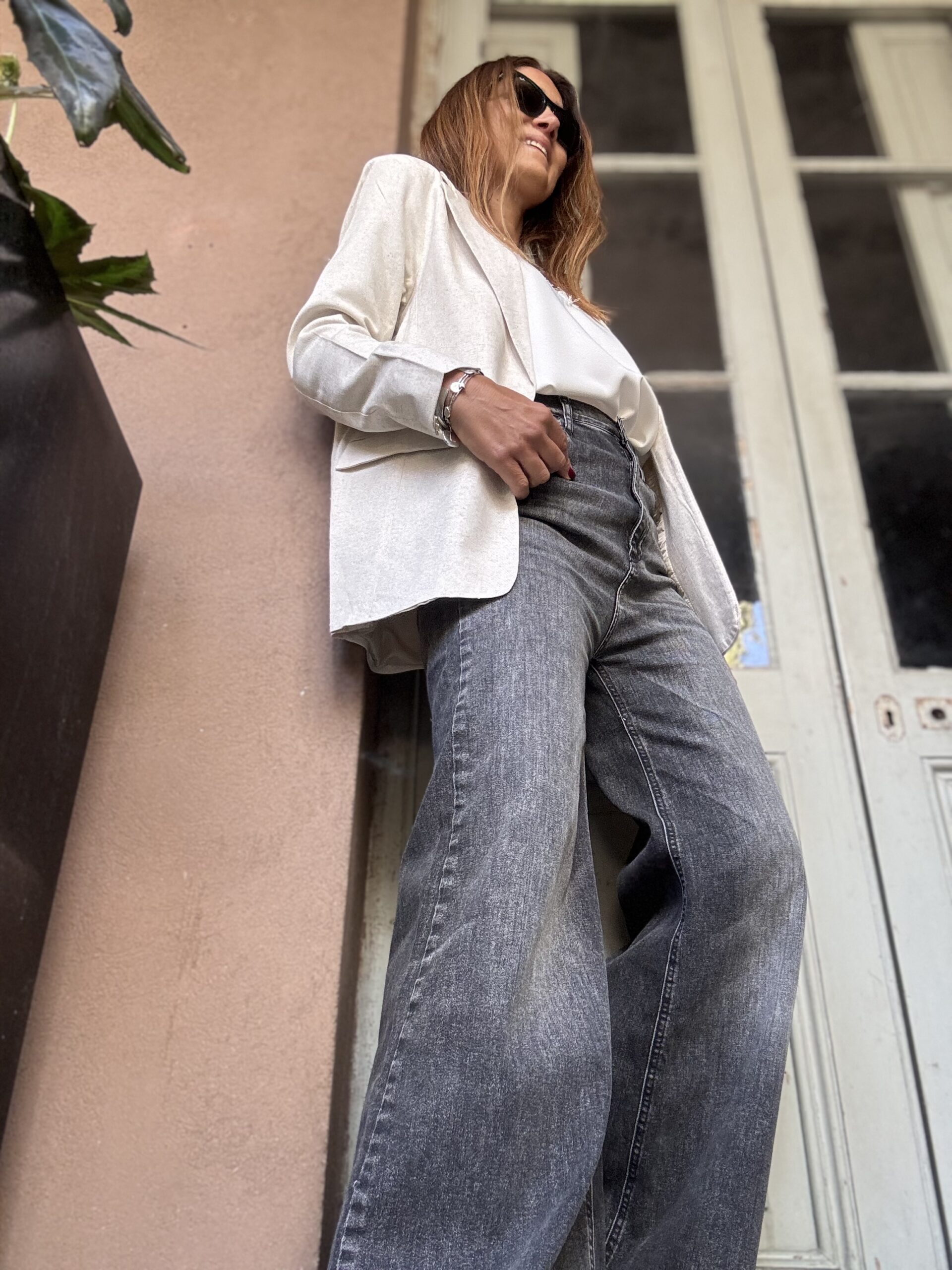 Jean Wide lavado gris con spandex. Cintura alta.