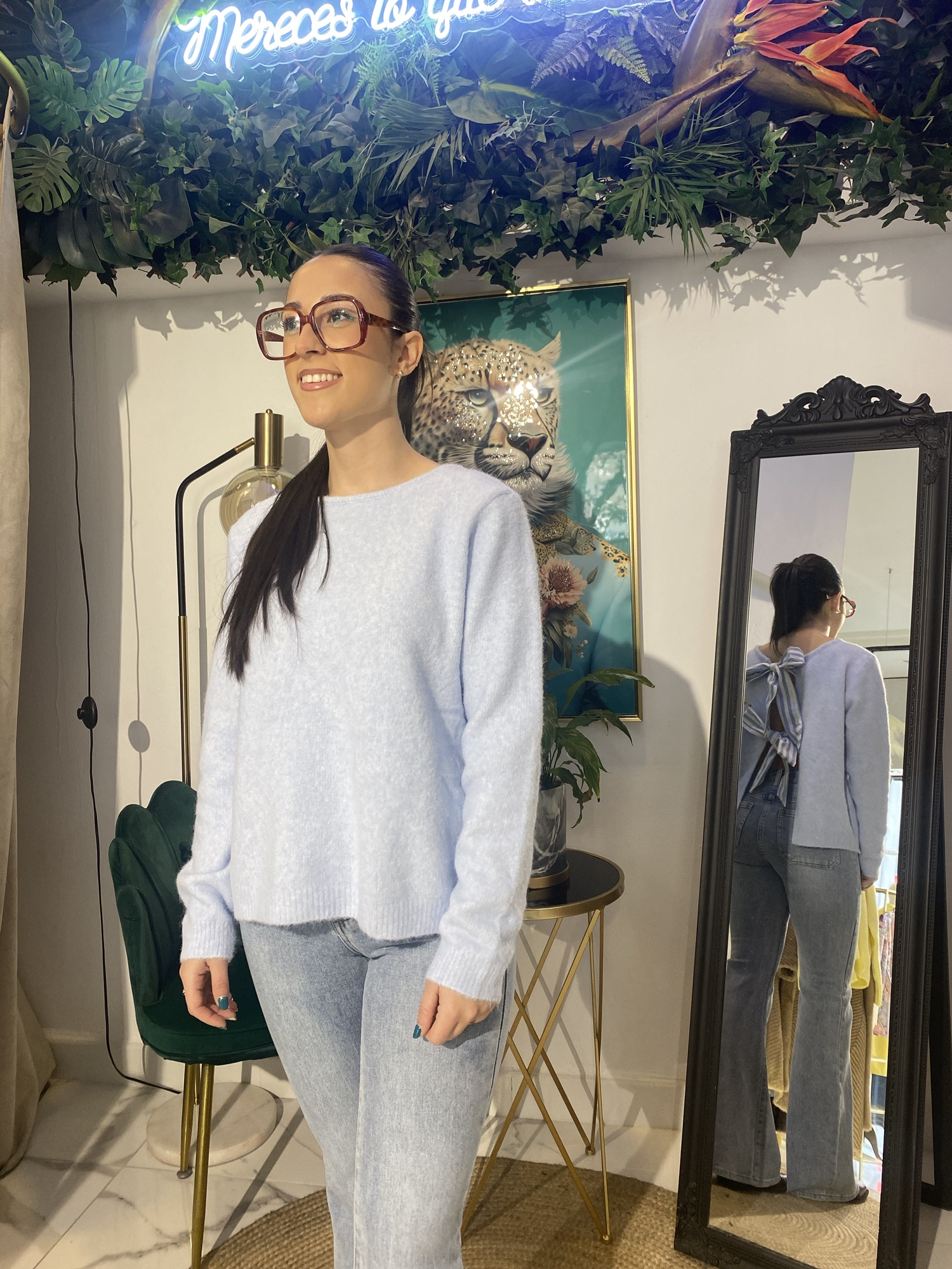 Este jersey de cuello caja con lazos en la espalda es una prenda imprescindible en tu armario. Su diseño atemporal te permite crear looks muy diferentes, desde un estilo casual con jeans y zapatillas deportivas hasta un outfit más arreglado con faldas o pantalones de vestir.