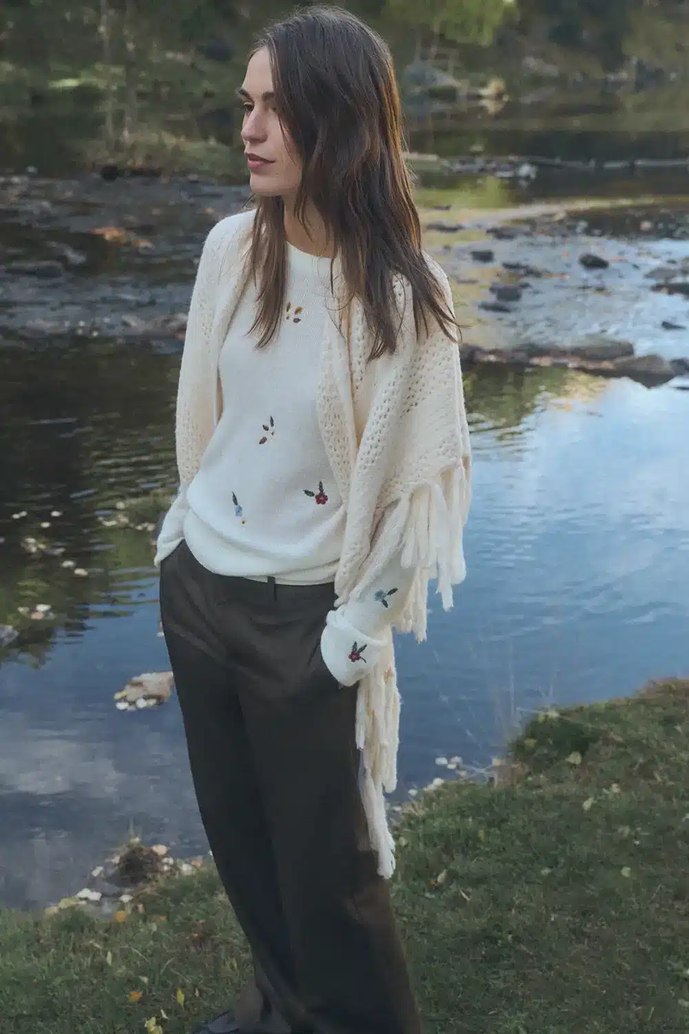 Jersey con mezcla de lana y punto perlado. Tejido ligeramente transparente. Flores bordadas multicolor sobre base en color crema. Con cuello tipo perkins. En color crema.