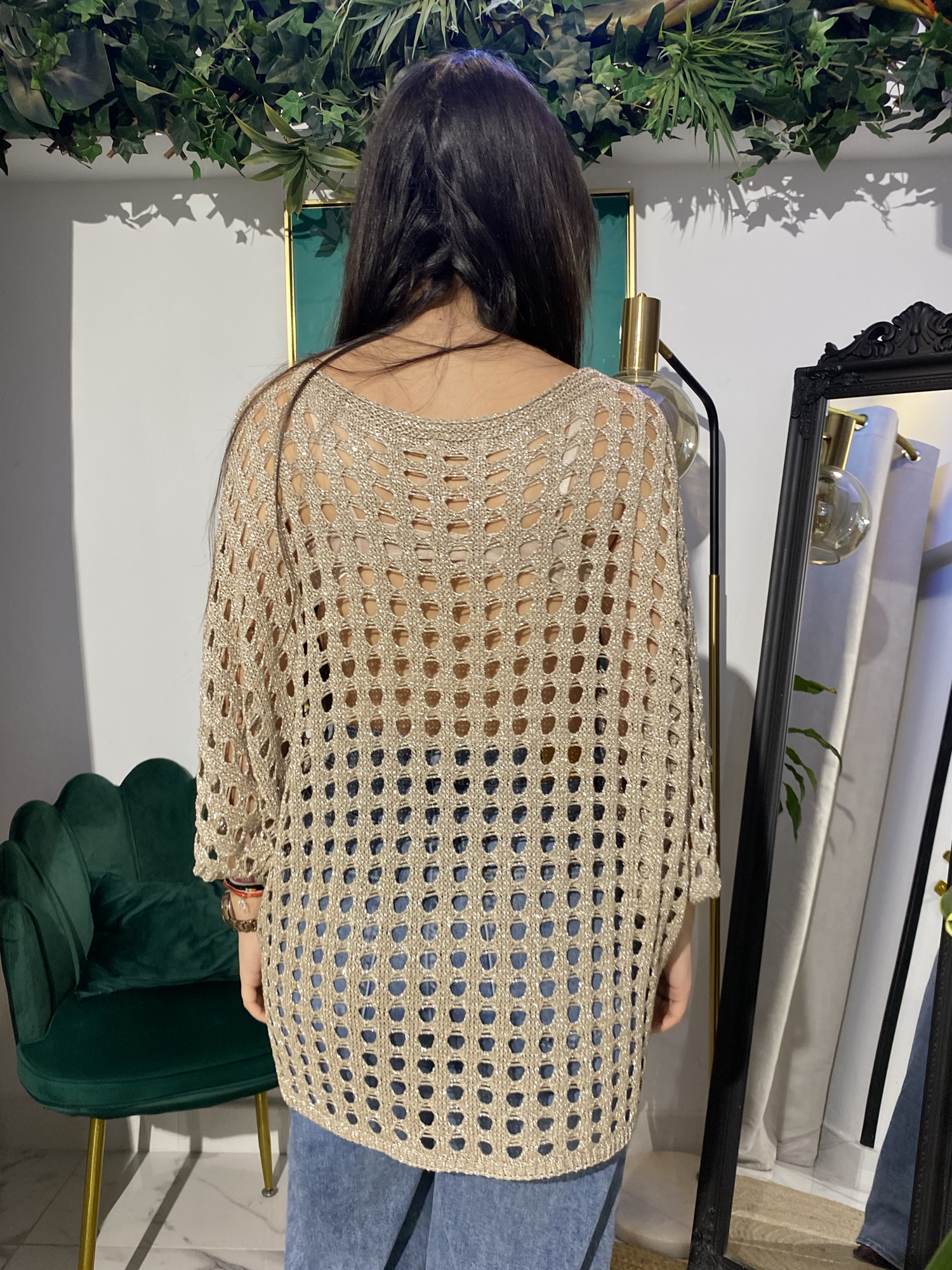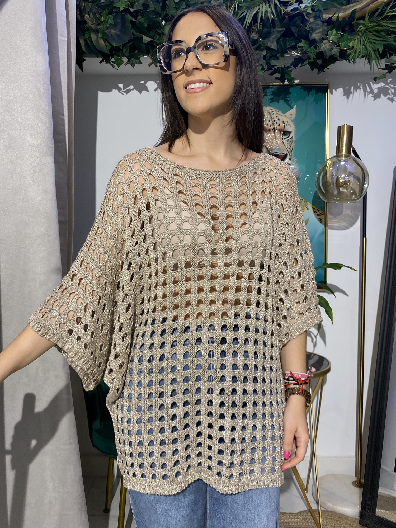 Un jersey largo oversize con lurex es una prenda moderna y llamativa que combina la comodidad de un jersey holgado con el brillo sutil y elegante del lurex. Es perfecto para añadir un toque de glamour a cualquier look, ya sea para ocasiones casuales o más arregladas.