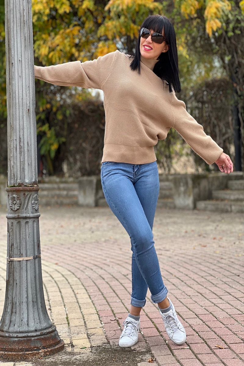 Jersey de un suave tono beige, perfecto para cualquier ocasión. Tiene un diseño elegante con mangas ajustadas que se adaptan al contorno de los brazos, brindando un look estilizado. El cuello alto añade un toque de sofisticación y calidez, ideal para los días más frescos. Este tipo de jersey es versátil y se puede combinar fácilmente con jeans, faldas o incluso debajo de un abrigo. ¡Es una prenda que seguramente se convertirá en un básico en tu armario!