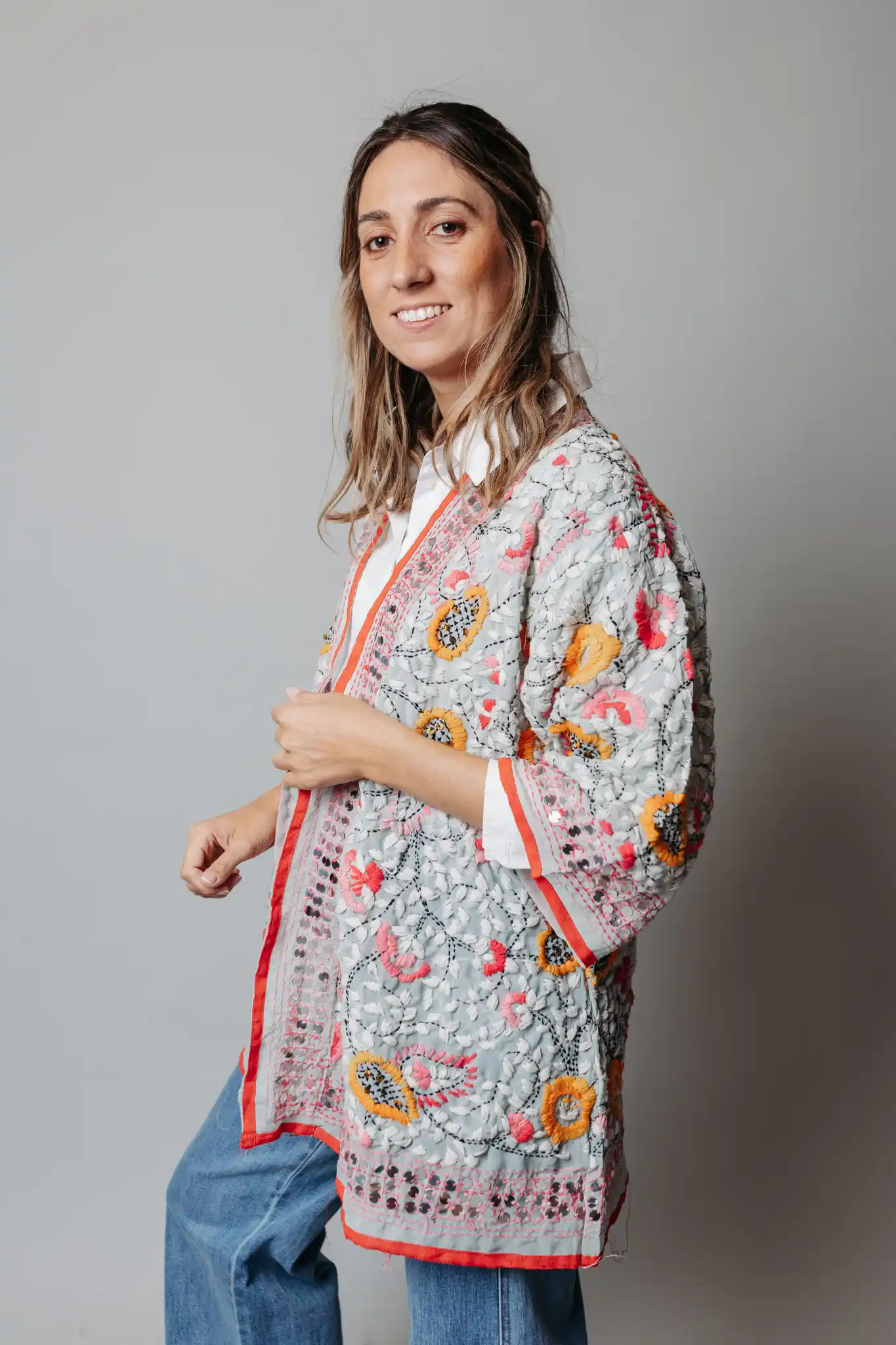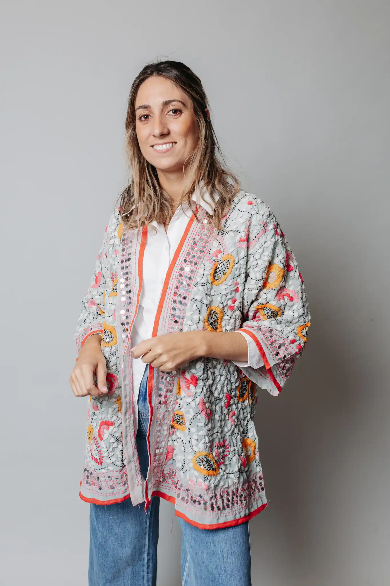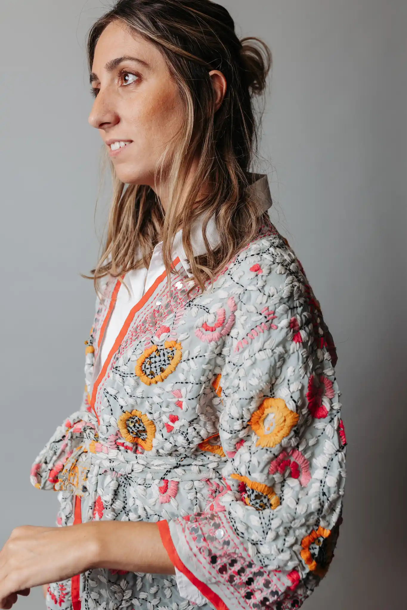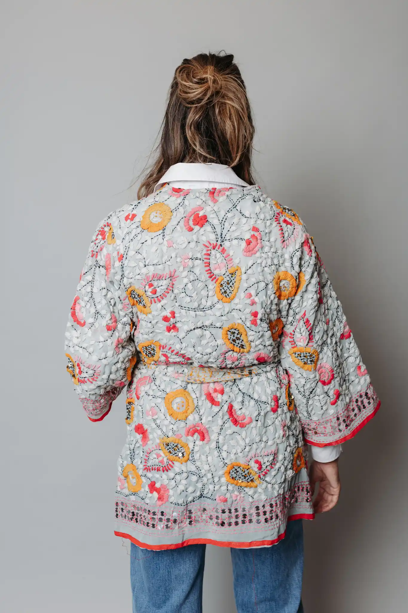 Kaftán de seda bordado en colores sobre fondo gris.
