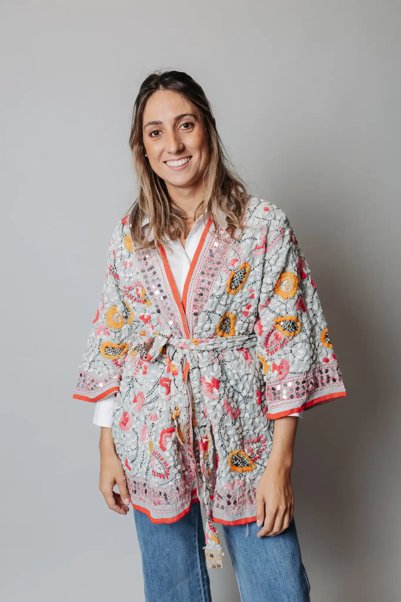 Nuestro kaftán de seda bordado con motivos florales en colores sobre fondo gris, es la prenda estrella de tus outfits boho-chic. ¡No te quedes sin el tuyo! ¡Haz tu pedido ahora!