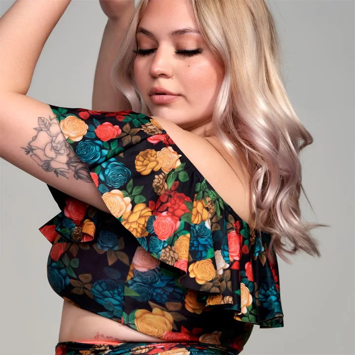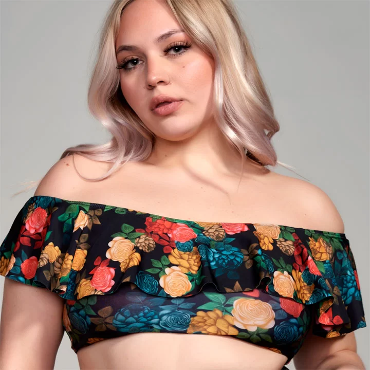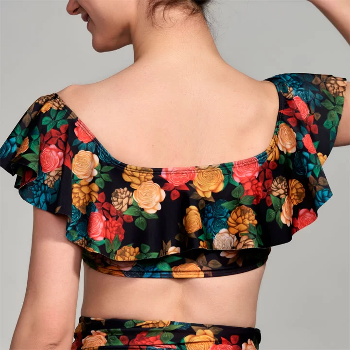 Corpiño de lycra con volado en delantera y espalda, y bolsillo para relleno o taza.