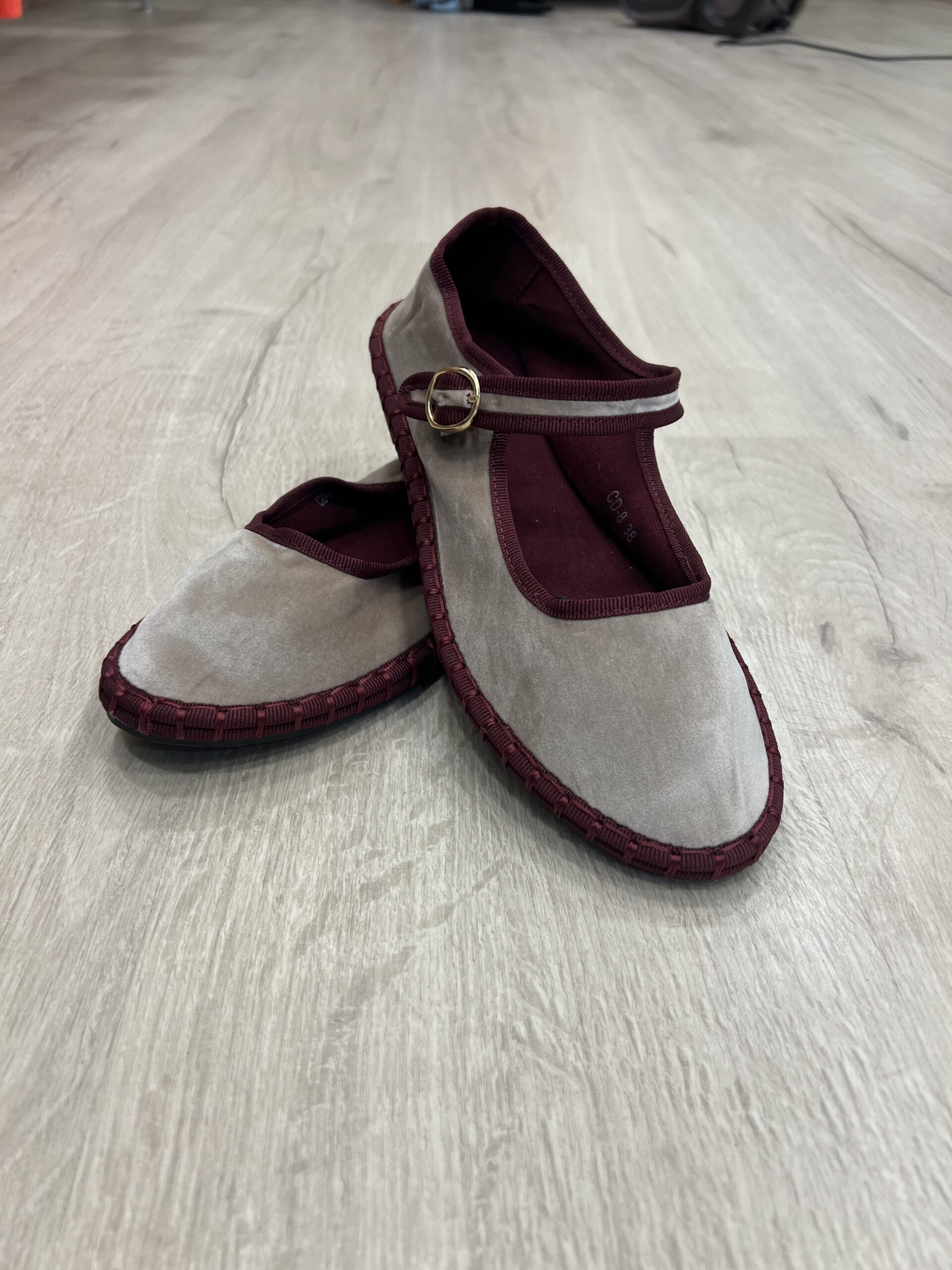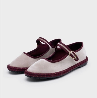 Merceditas de terciopelo en color beige con los ribetes en granate, y el cierre es con hebilla, la suela es de caucho.