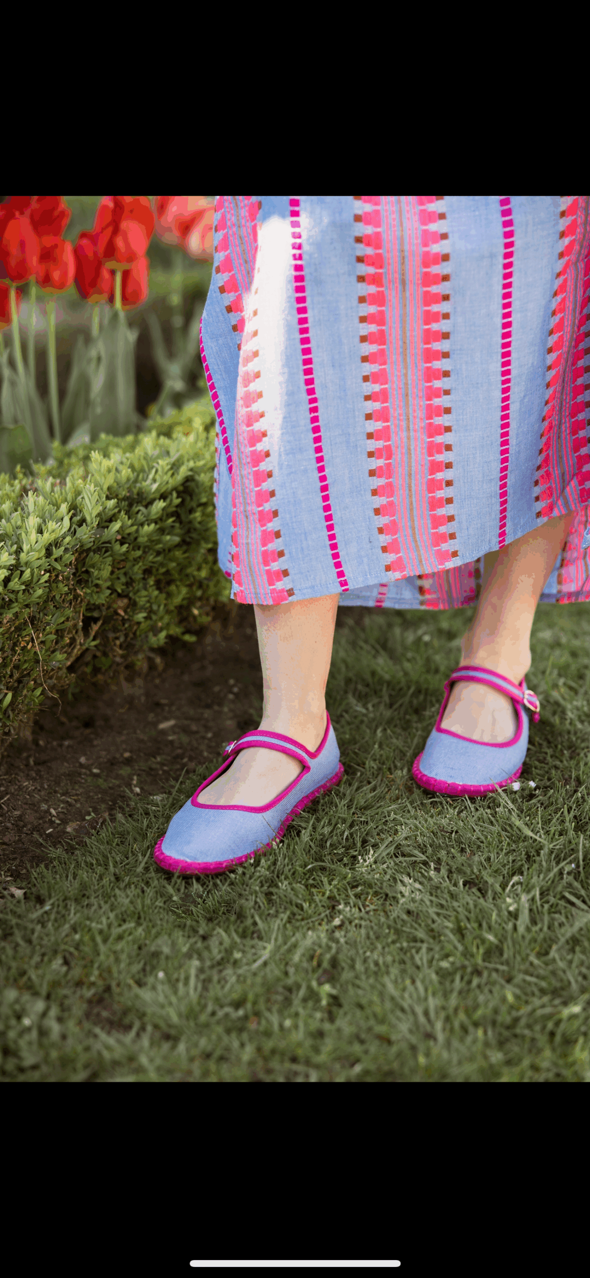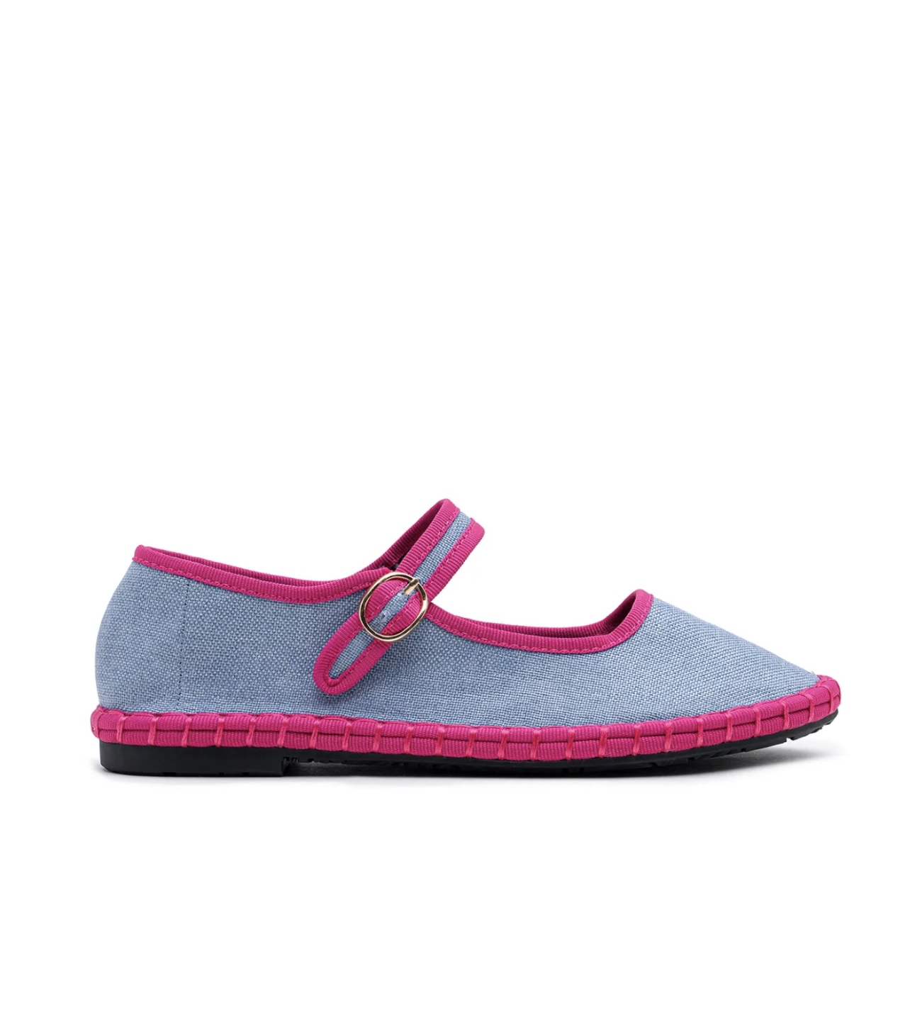 Merceditas de lino en color azul vaquero con los ribetes en fucsia, y el cierre es con hebilla, la suela es de caucho.