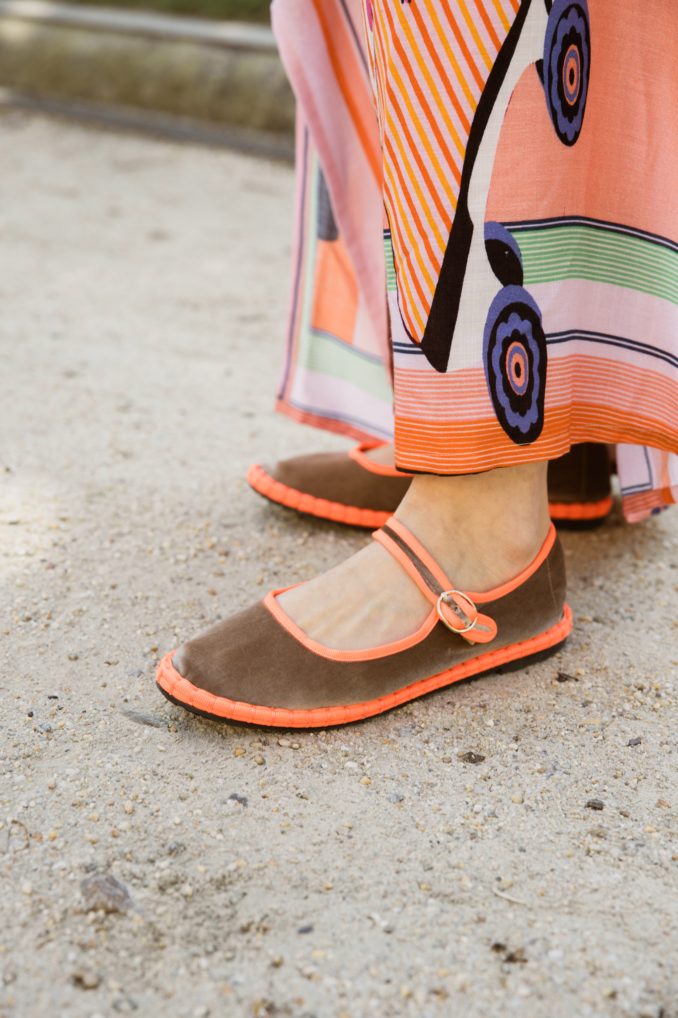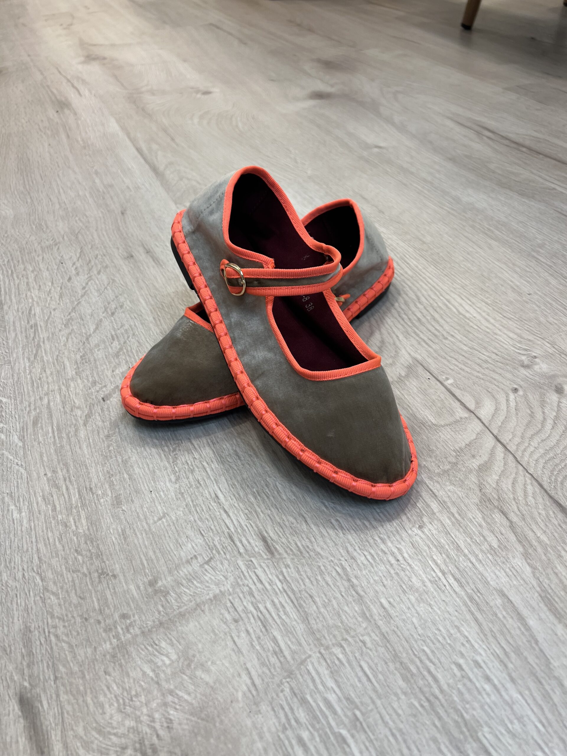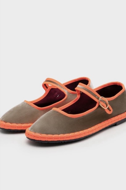 Merceditas de terciopelo en color beige con los ribetes en naranja flúor, y el cierre es con hebilla, la suela es de caucho.