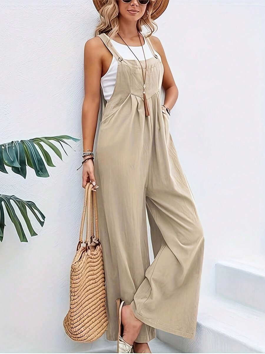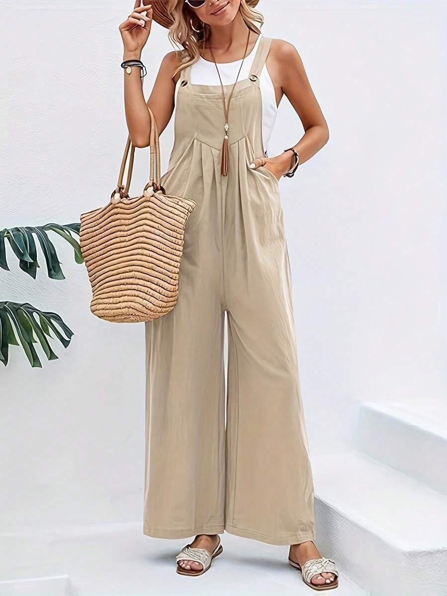 Composición: Soft Poliéster (símil algodón). Este mono beige es la combinación perfecta de comodidad y estilo. Con tirantas ajustadas, un diseño de pierna ancha y prácticos bolsillos, es ideal para un look casual y dulce. Su tela elástica y suave asegura un ajuste cómodo que se adapta a tu figura. El color caqui sólido lo hace fácil de combinar con cualquier accesorio.