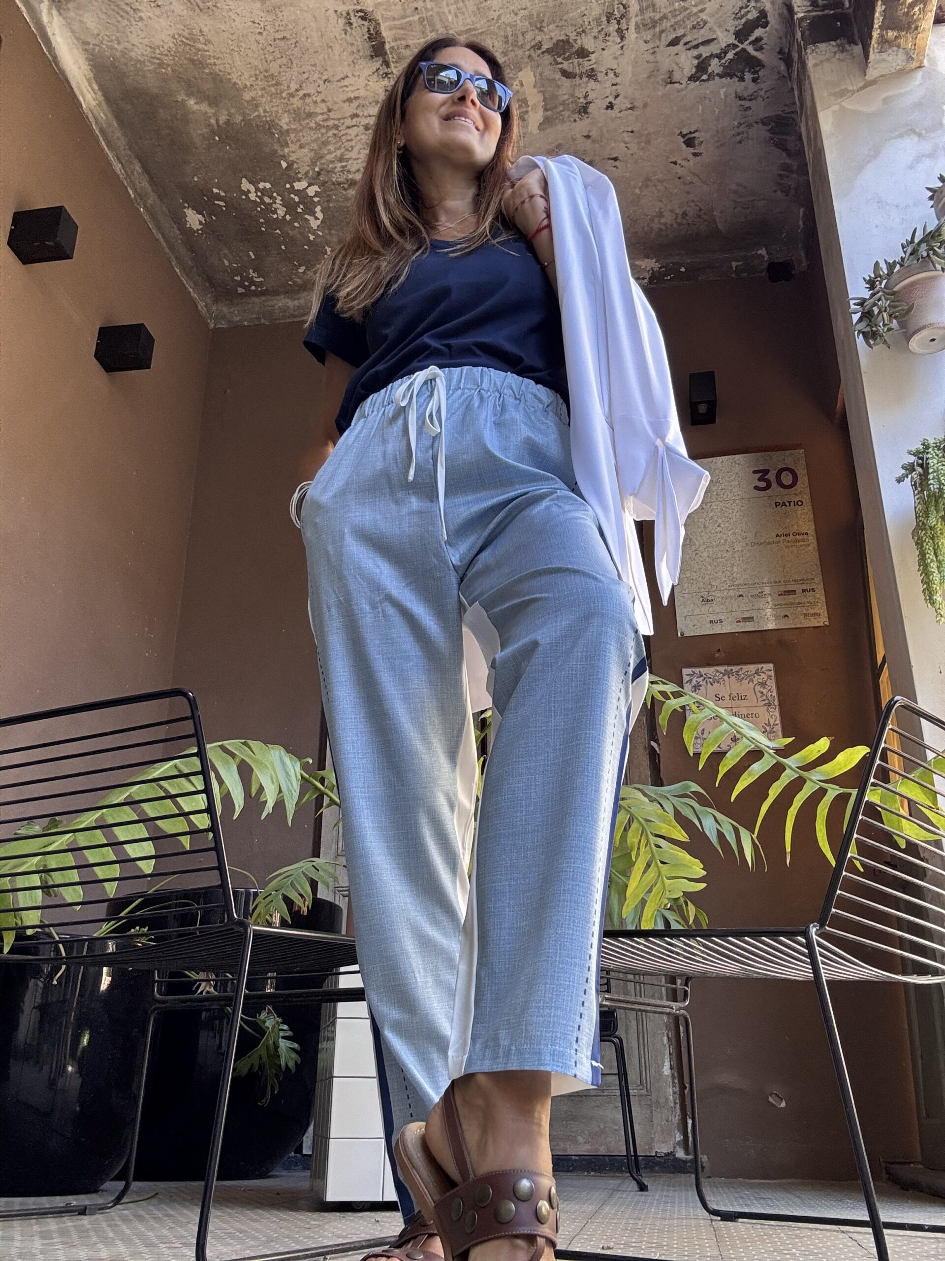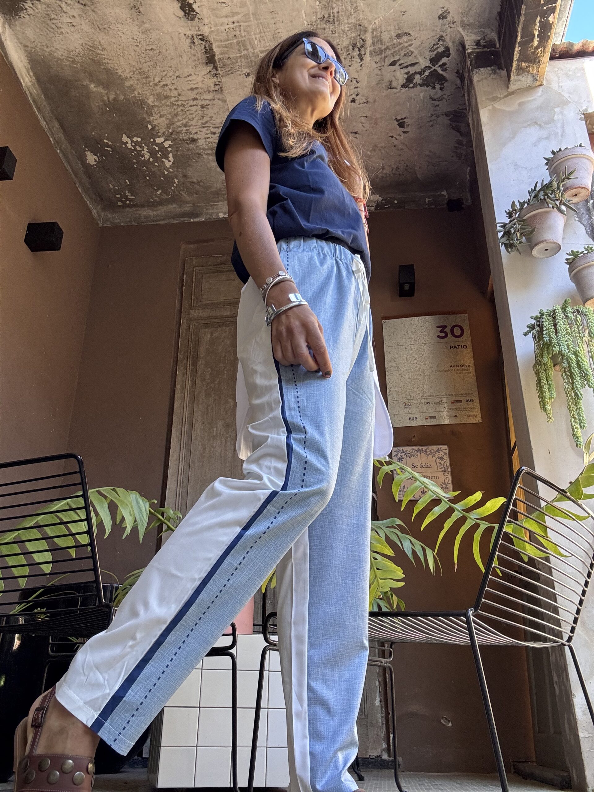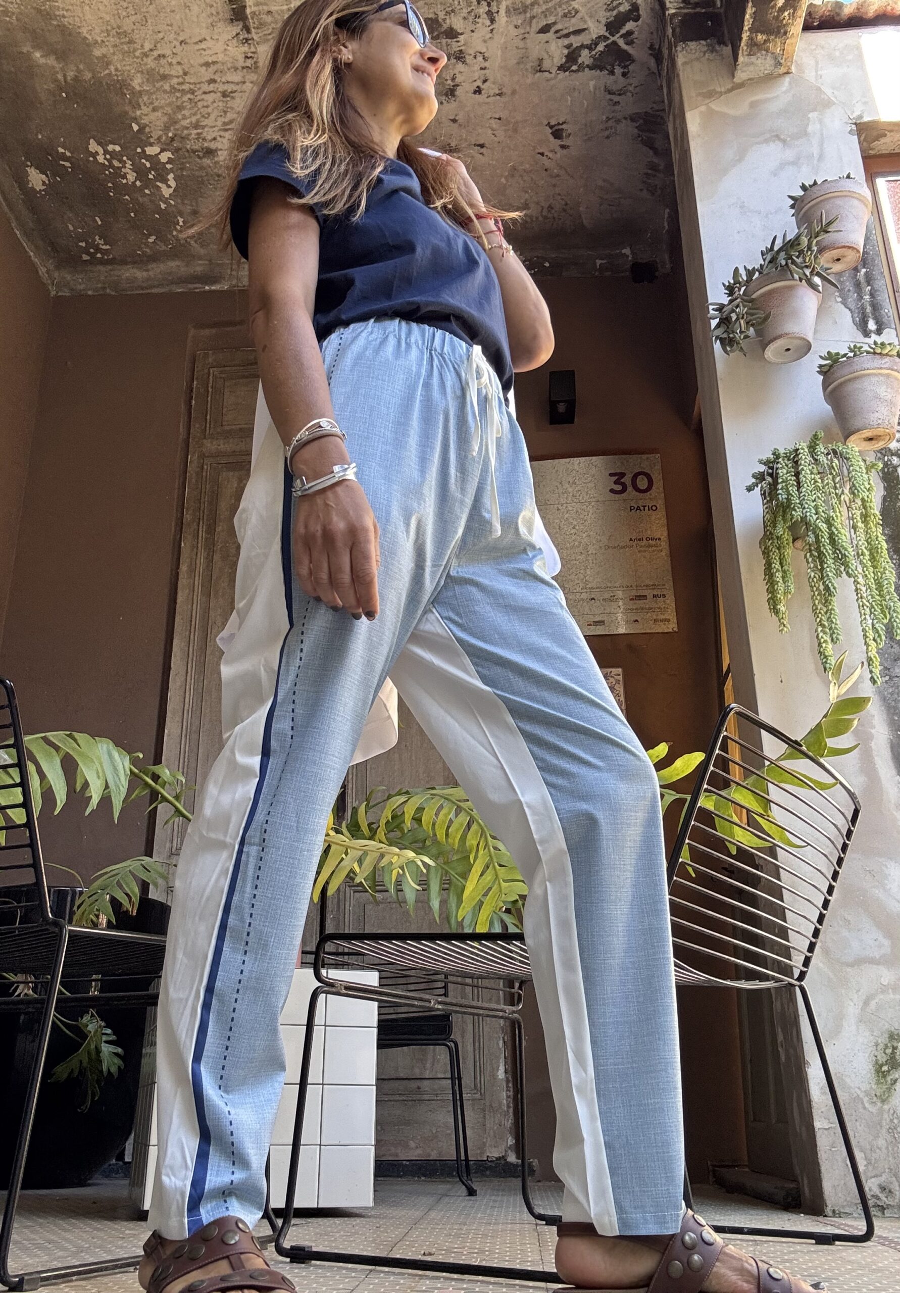 Pantalón recto, de estilo deportivo , super cómodo. Está confeccionado en tela liviana color celeste jaspeado, con la parte de atrás blanca, estilizando de esa manera la silueta. A lo largo del lateral lleva una línea azul marino que refuerza el estilo sport.