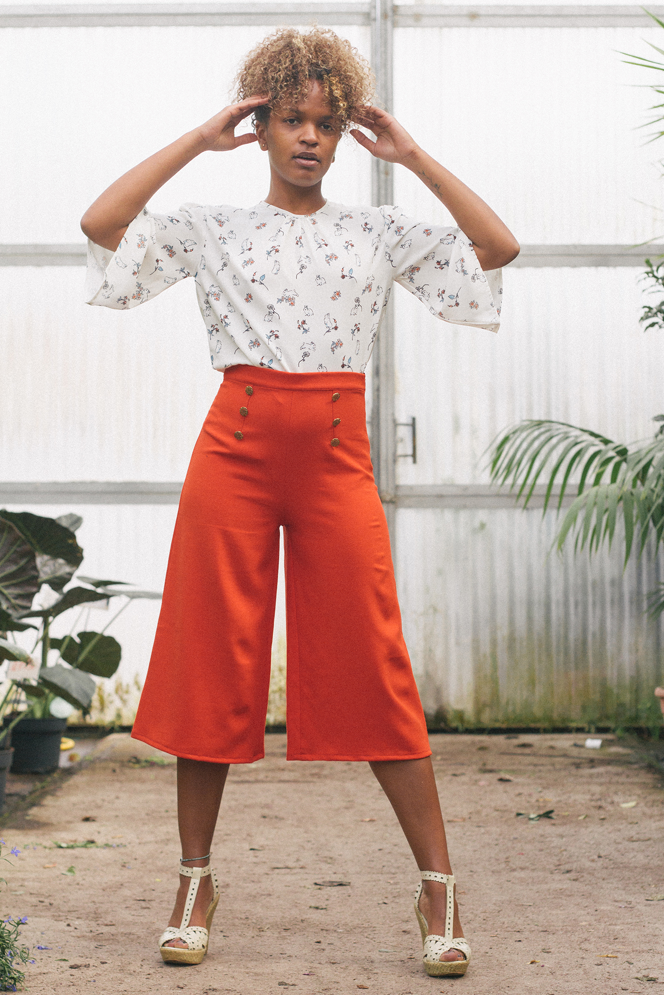Pantalón culotte color teja con cintura alta en tejido de punto suave de algodón, con bolsillos en la espalda, cremallera lateral y botones vintage labrados en el delantero. ¡Súper cómodo! 97% algodón 3% elastán.