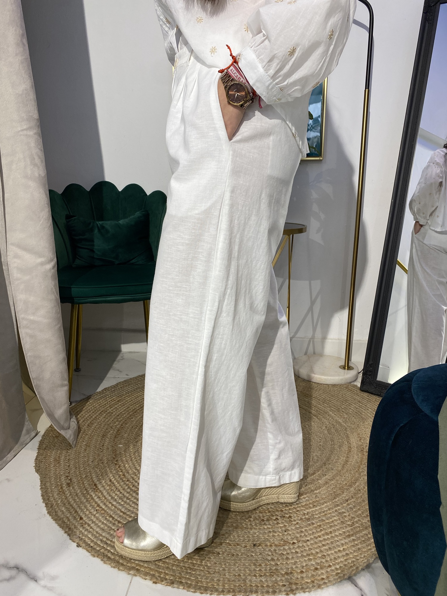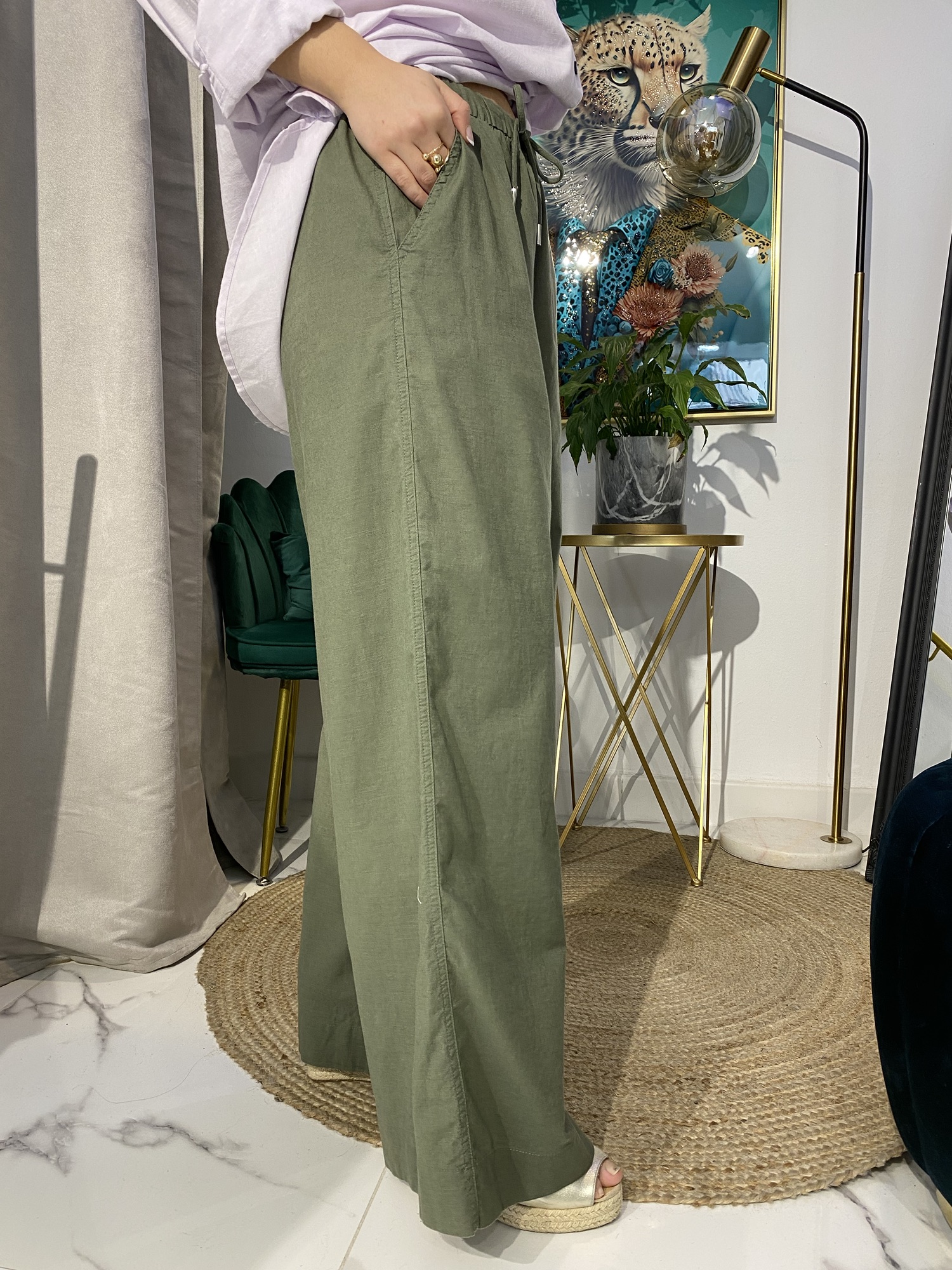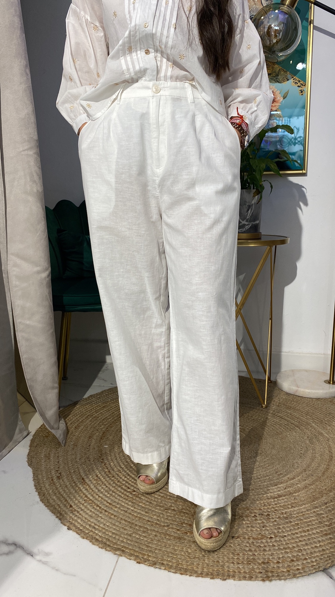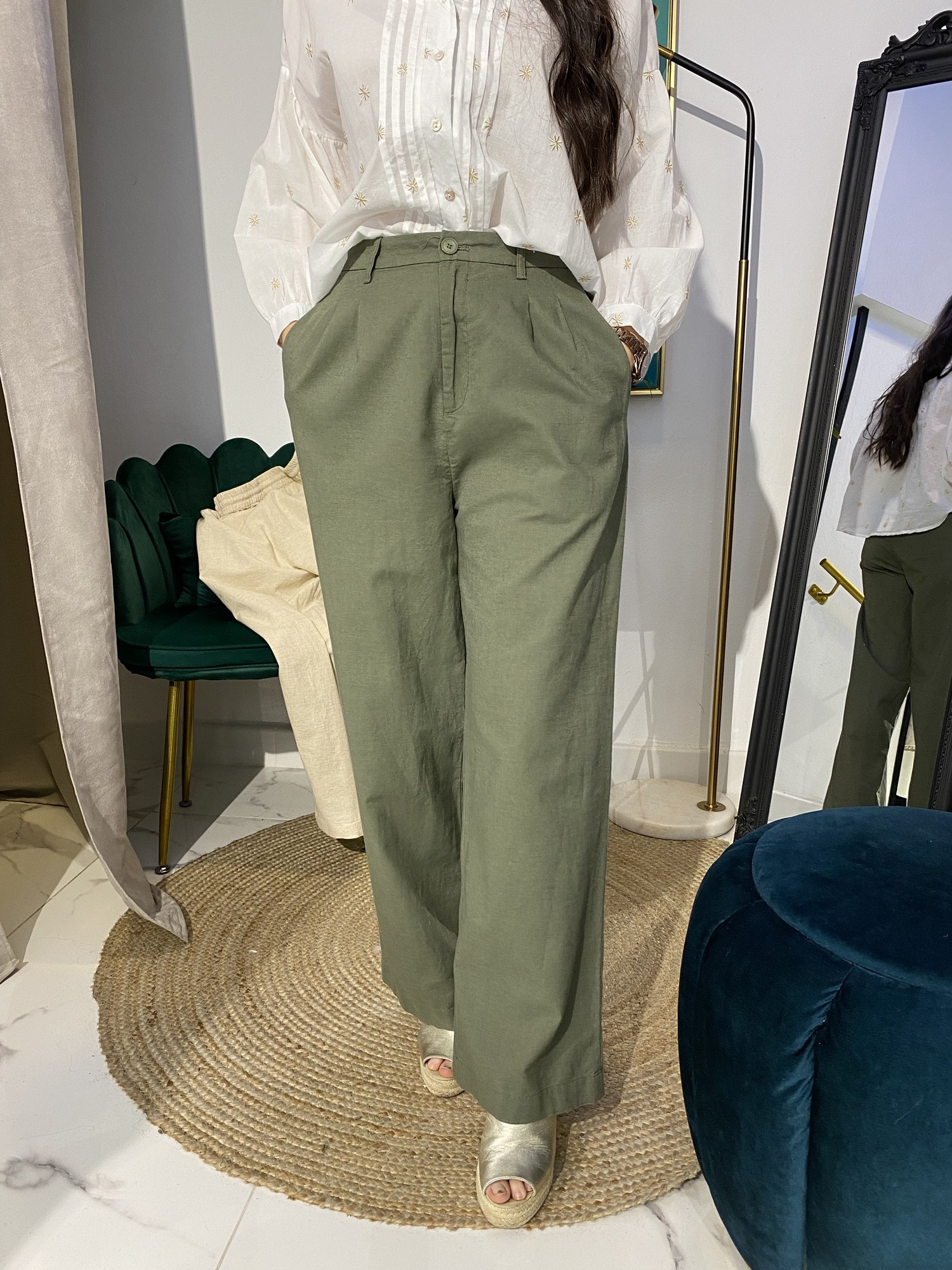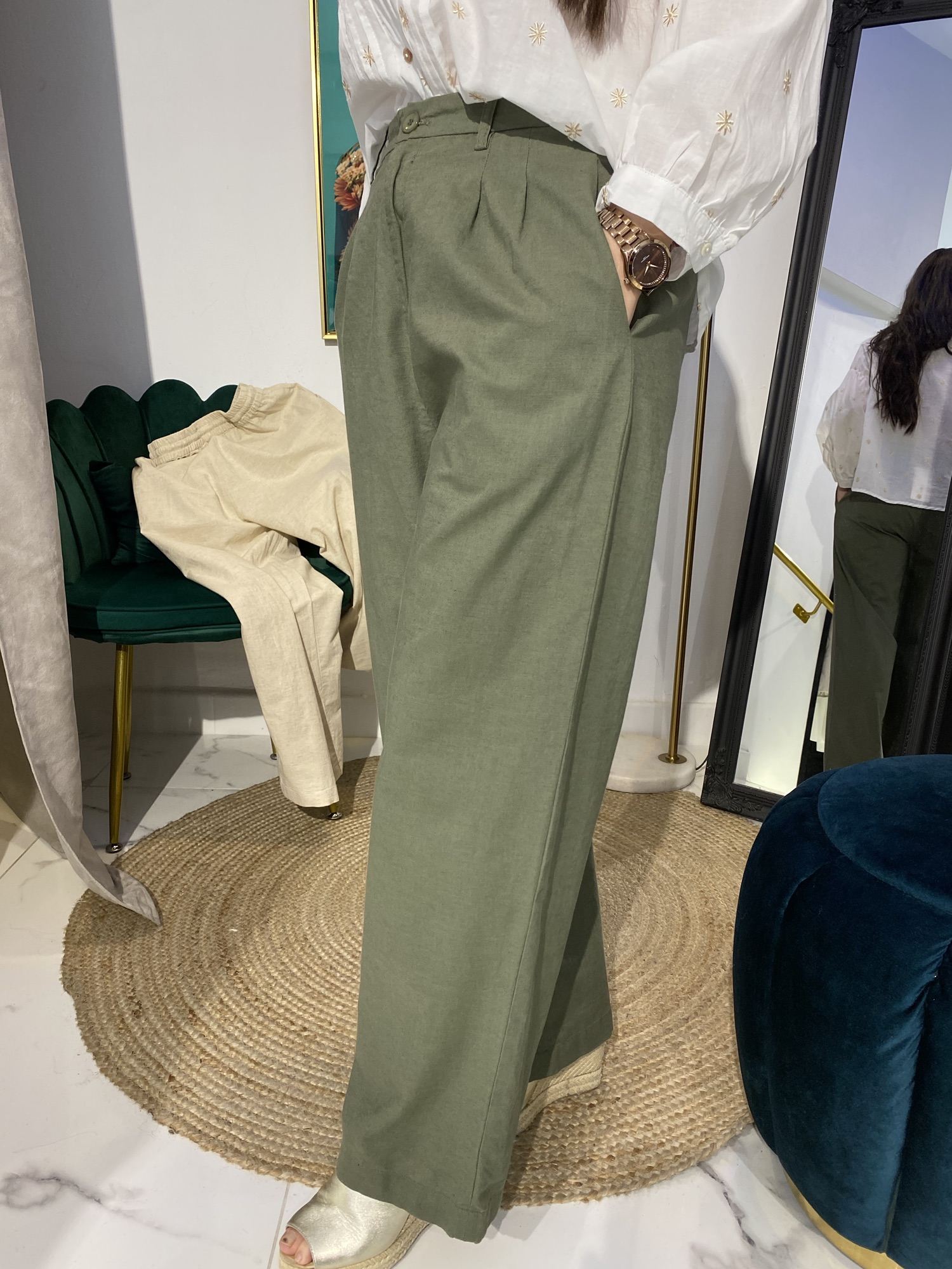 Pantalón de lino ligero y fresco, perfecto para los días cálidos. Su diseño cómodo y elegante se adapta a cualquier ocasión, con botón frontal y goma trasera para un ajuste perfecto.