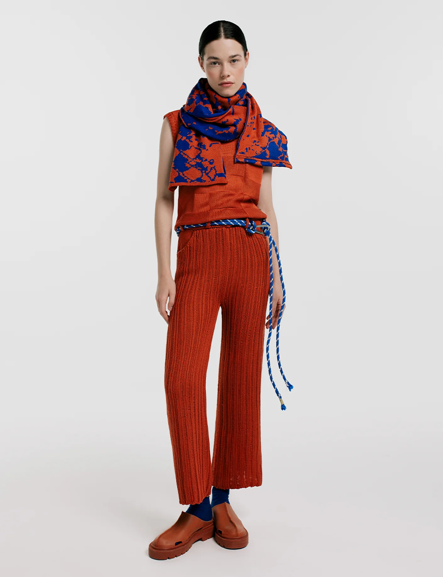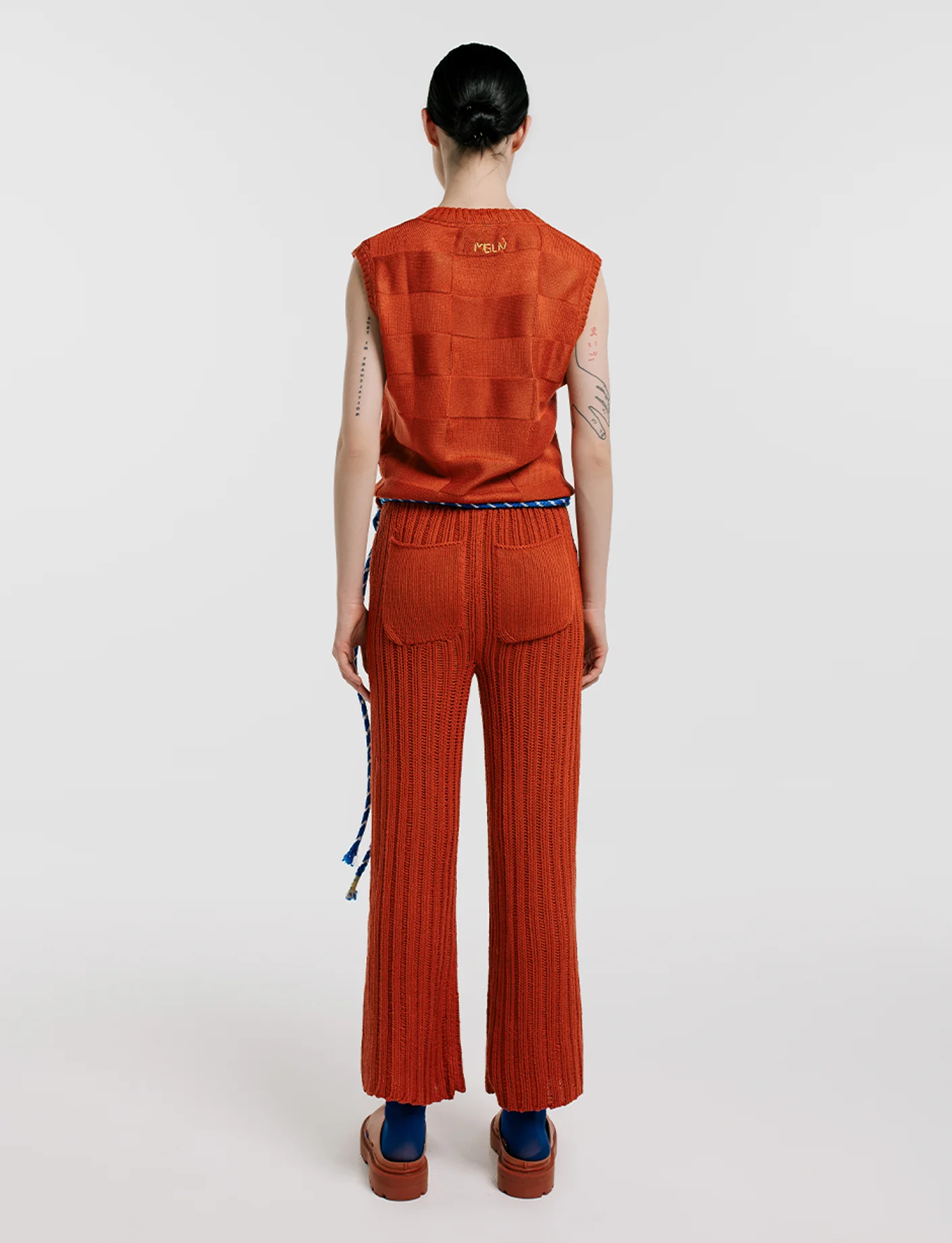 Pantalón tejido en Hilo Hipoalergénico en color terracota liso. Fit relajado con cintura elástica y caída recta. Tejido de punto, terminado y bordado a mano. Hecho artesanalmente en Sogamoso, Boyacá. Disponibilidad en todas las tallas.