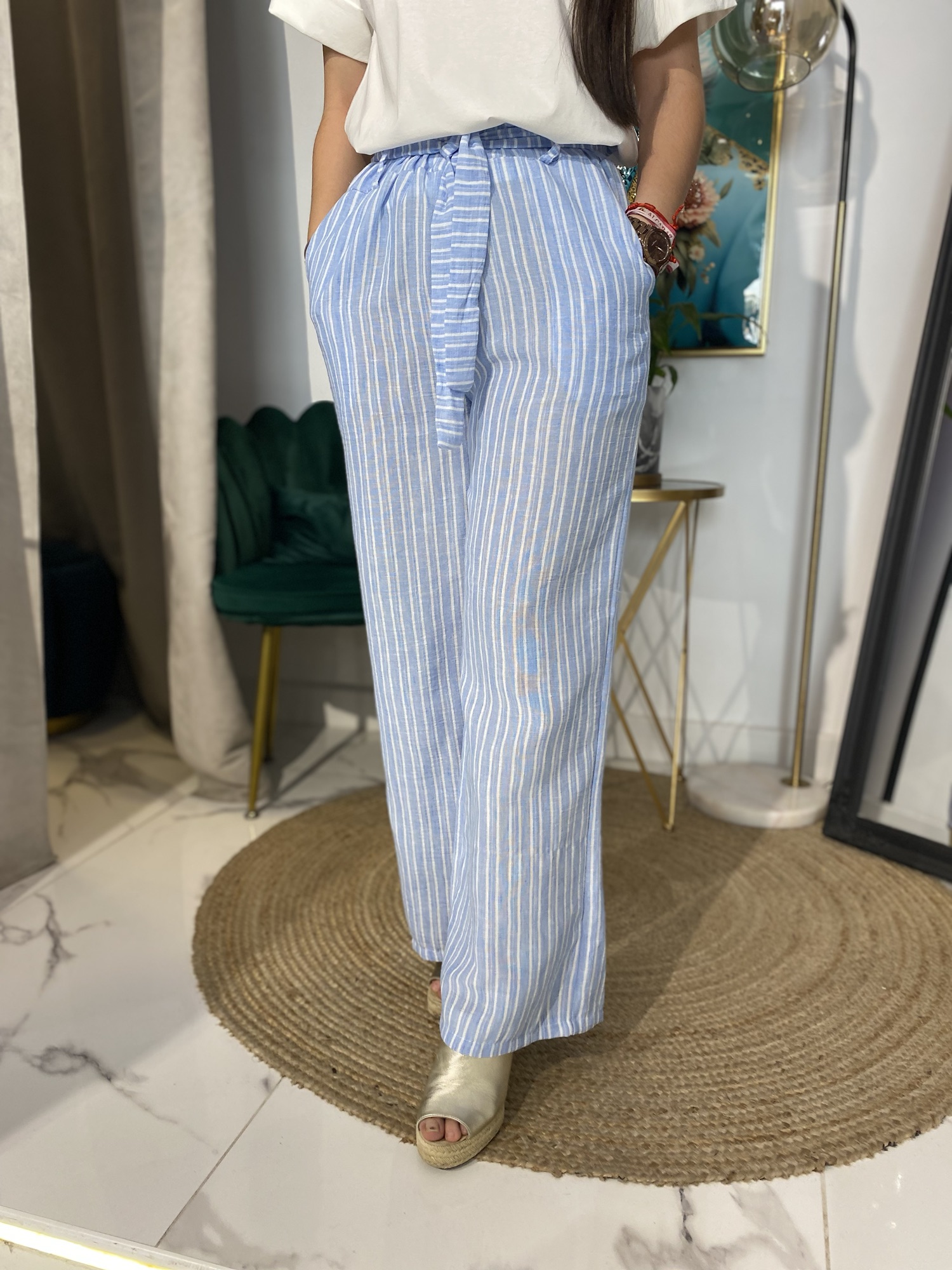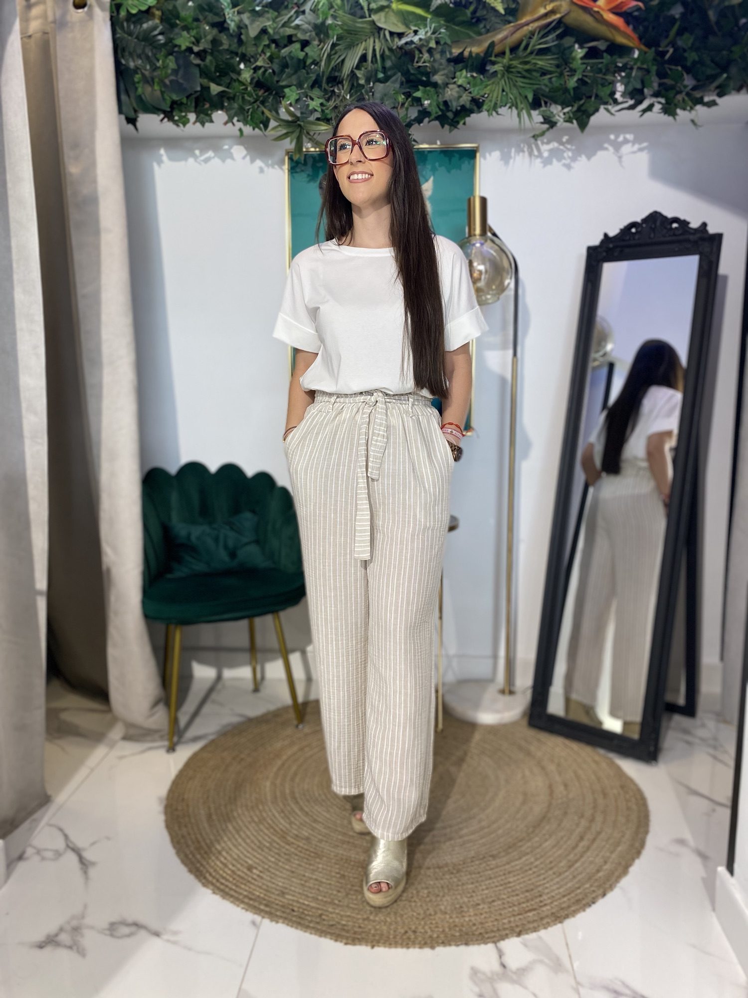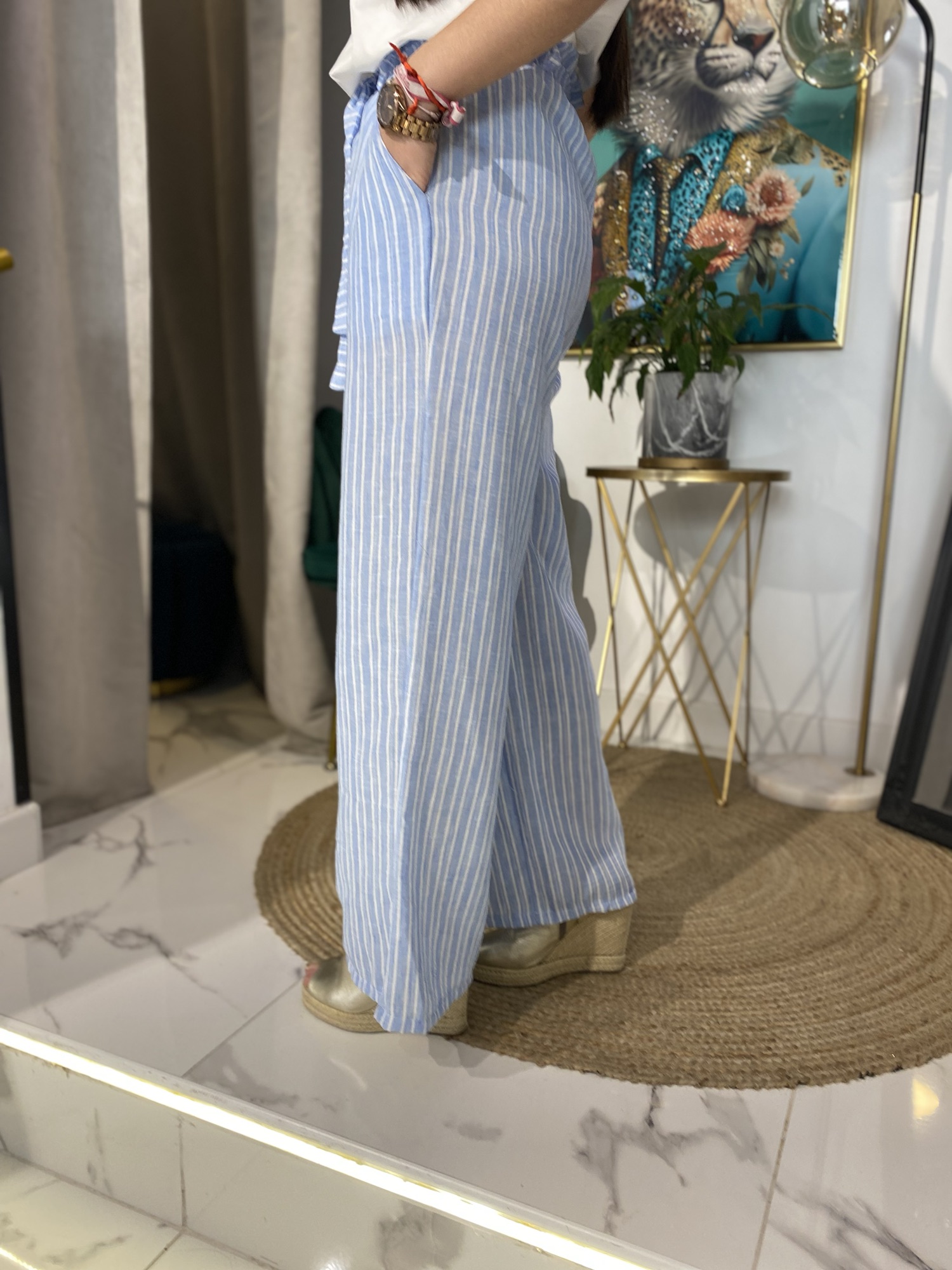 Un imprescindible para un armario versátil: pantalón palazzo de rayas con cintura de goma. Su diseño fluido y ligero te permite moverte con libertad, mientras que la cintura elástica facilita su colocación y asegura un ajuste cómodo durante todo el día. Combínalo fácilmente para crear looks casuales o más arreglados.