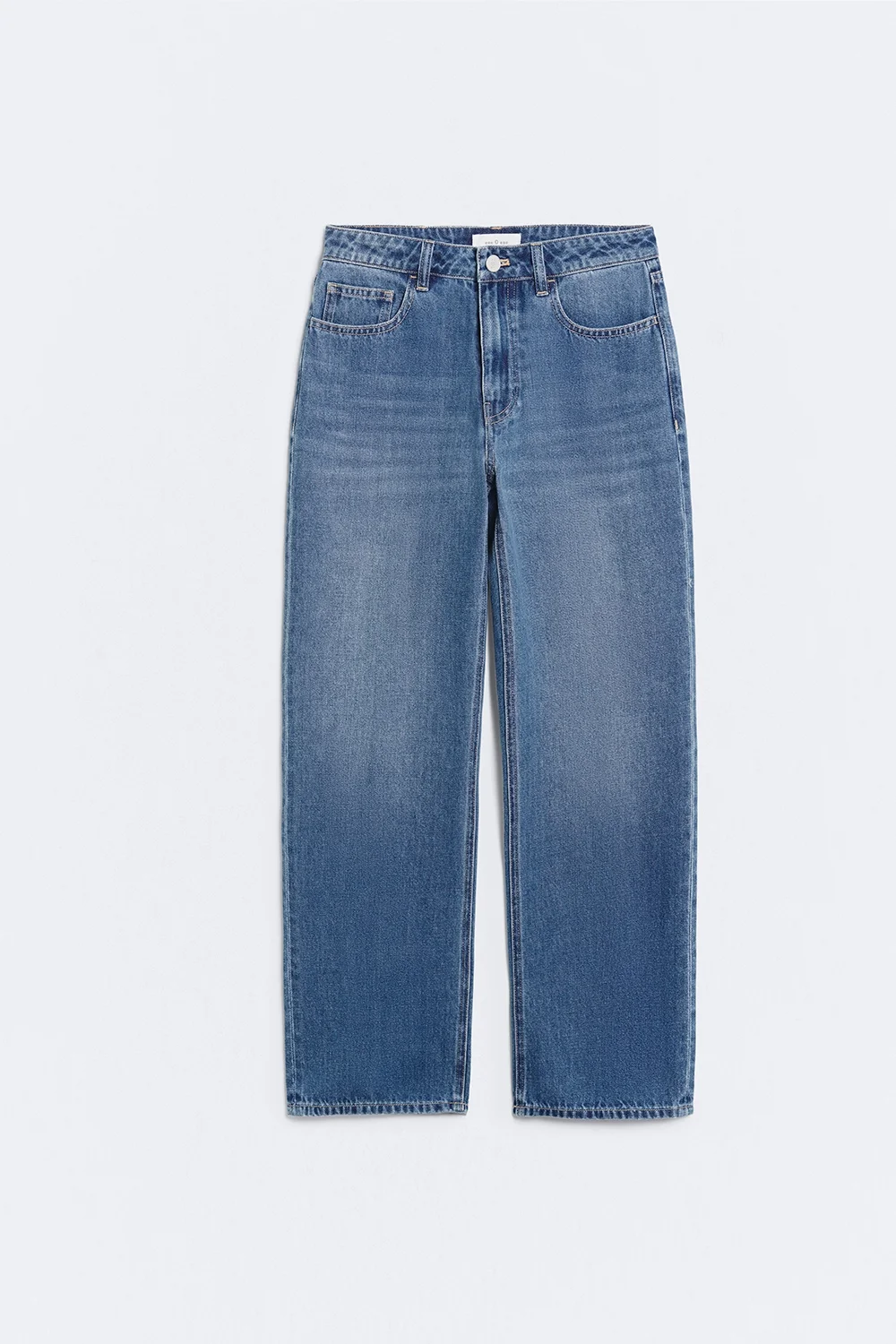 Pantalón de tiro alto recto y largo crop. Hecho de algodón BCI. Estilo Denim. Cierre mediante botón y cremallera. 5 bolsillos. Trabillas en cintura.