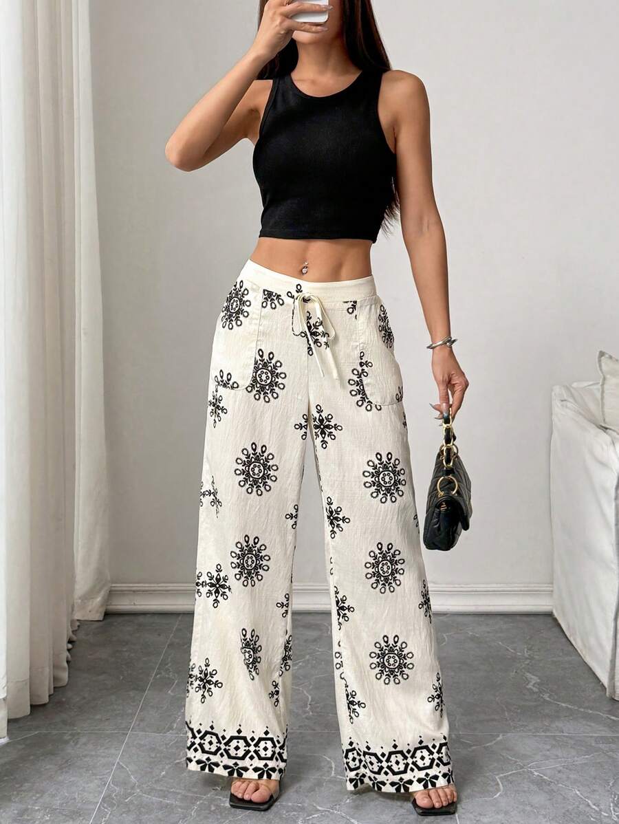 Pantalones Amplios con Cinturón y Estampado Floral