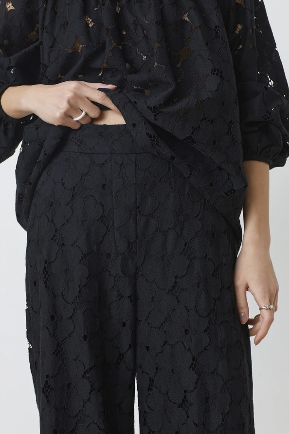 Pantalón ancho de encaje. Parte elástica en la parte trasera de la cintura. Cierre con cremallera oculta en el lateral. Perneras anchas.