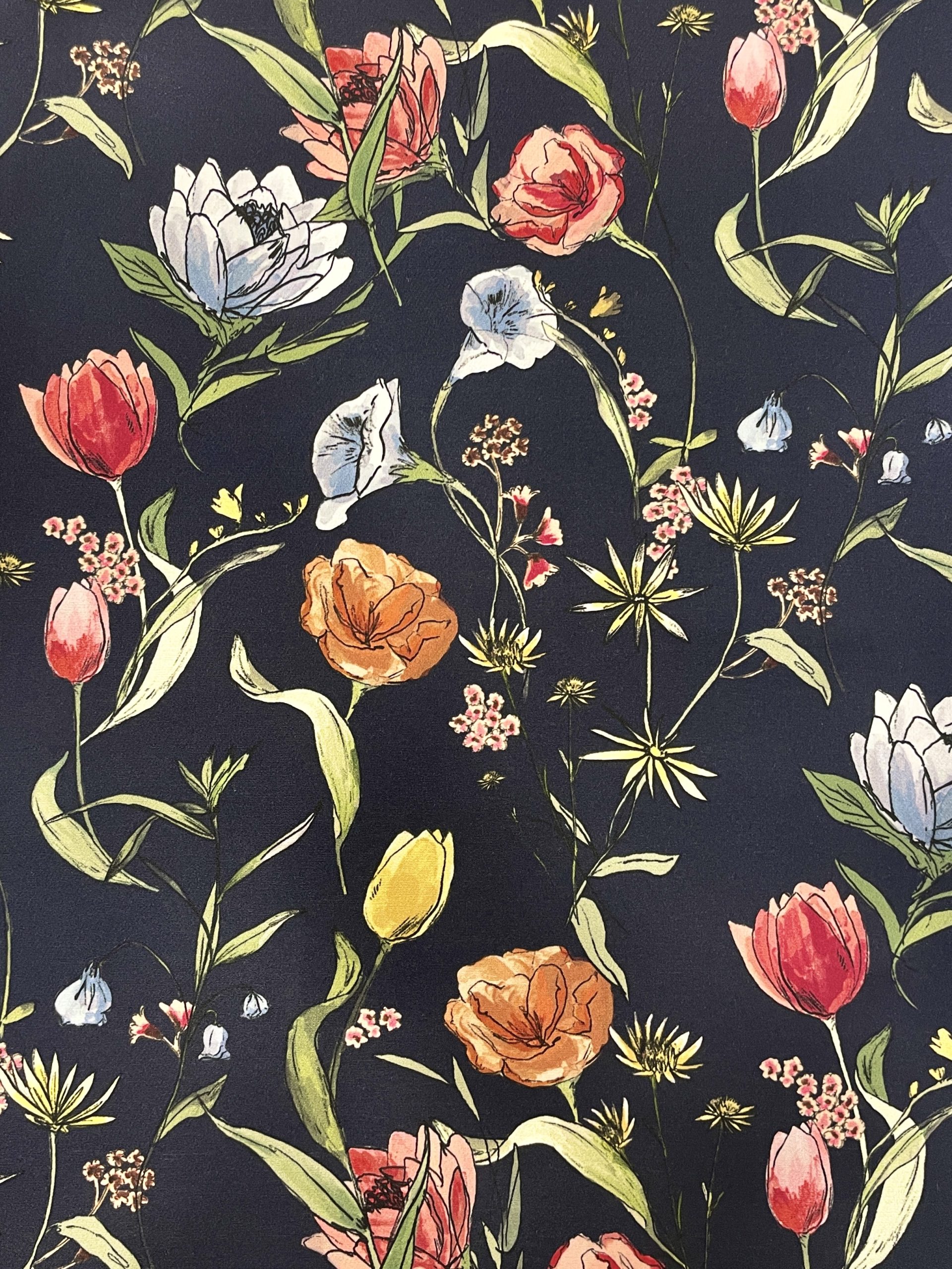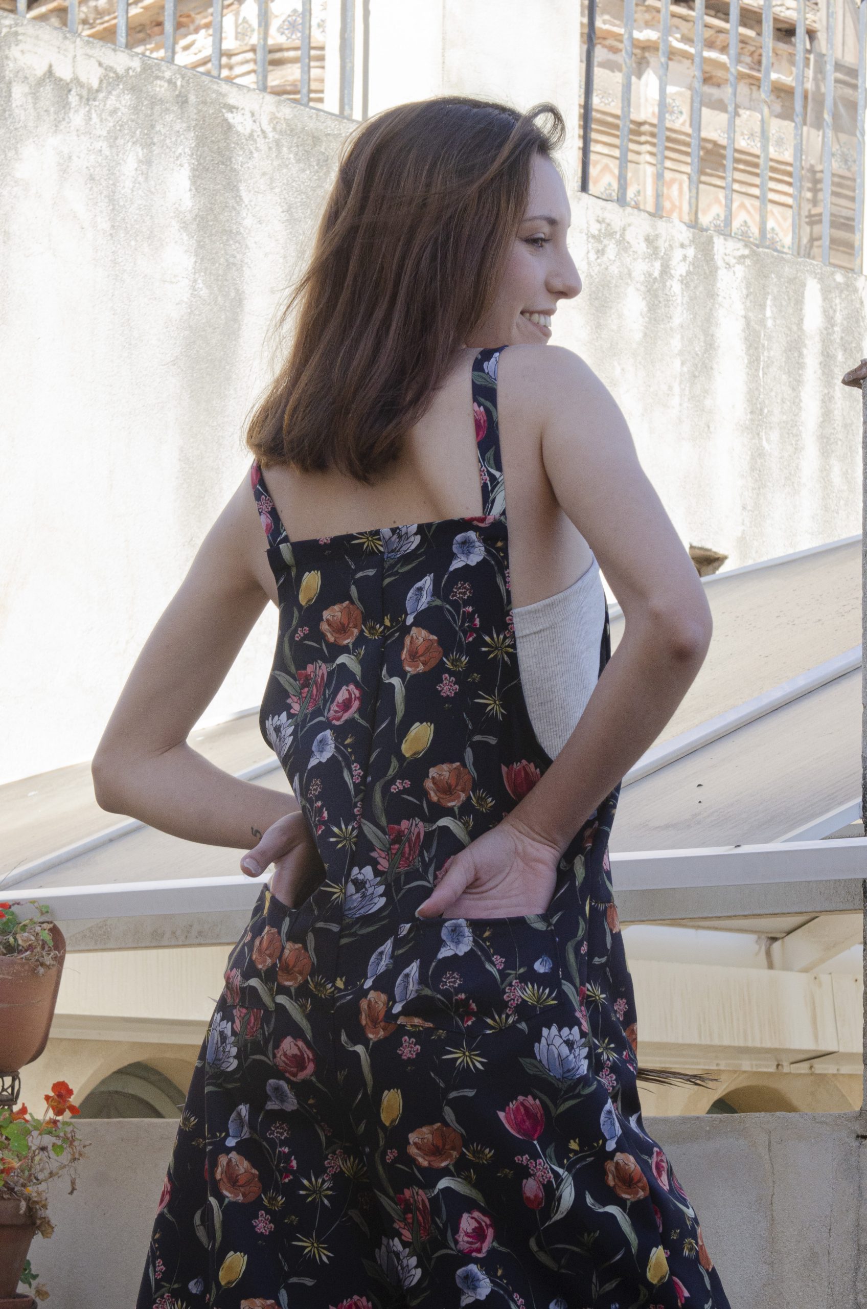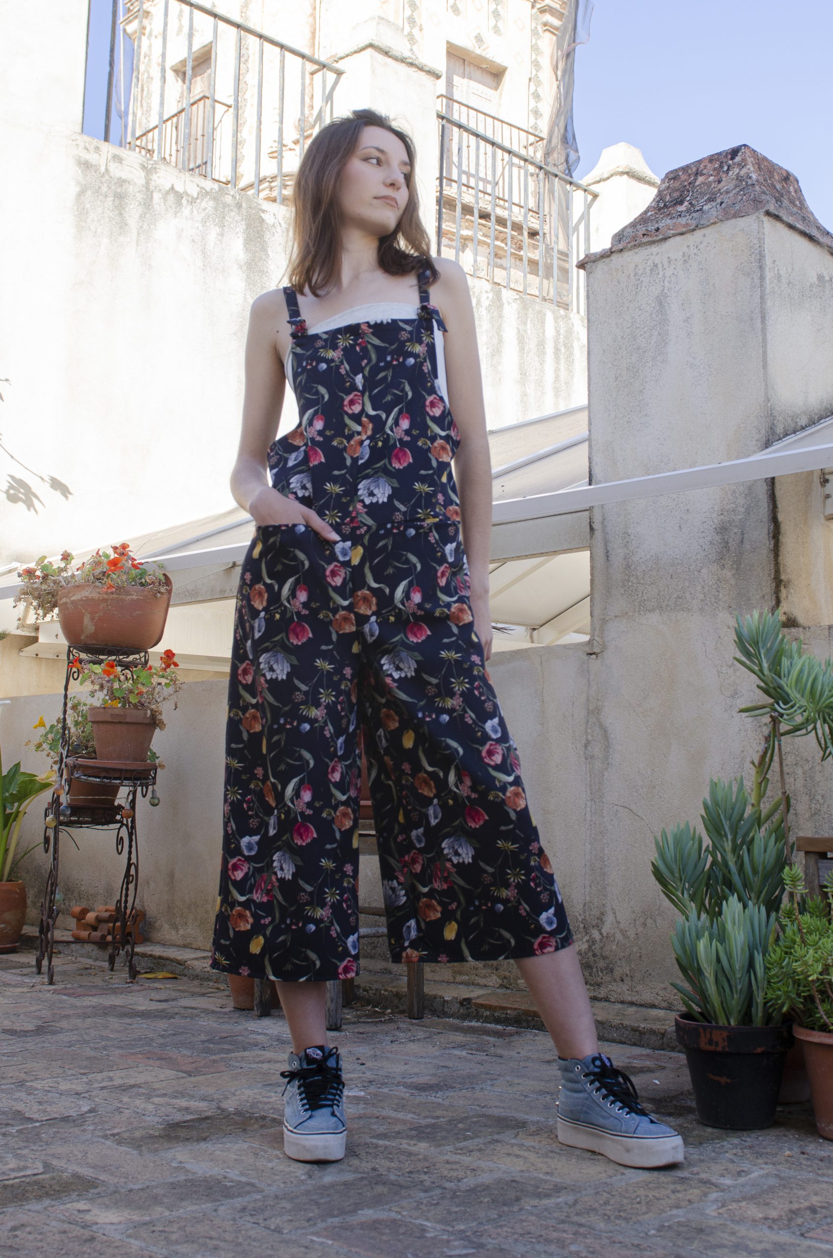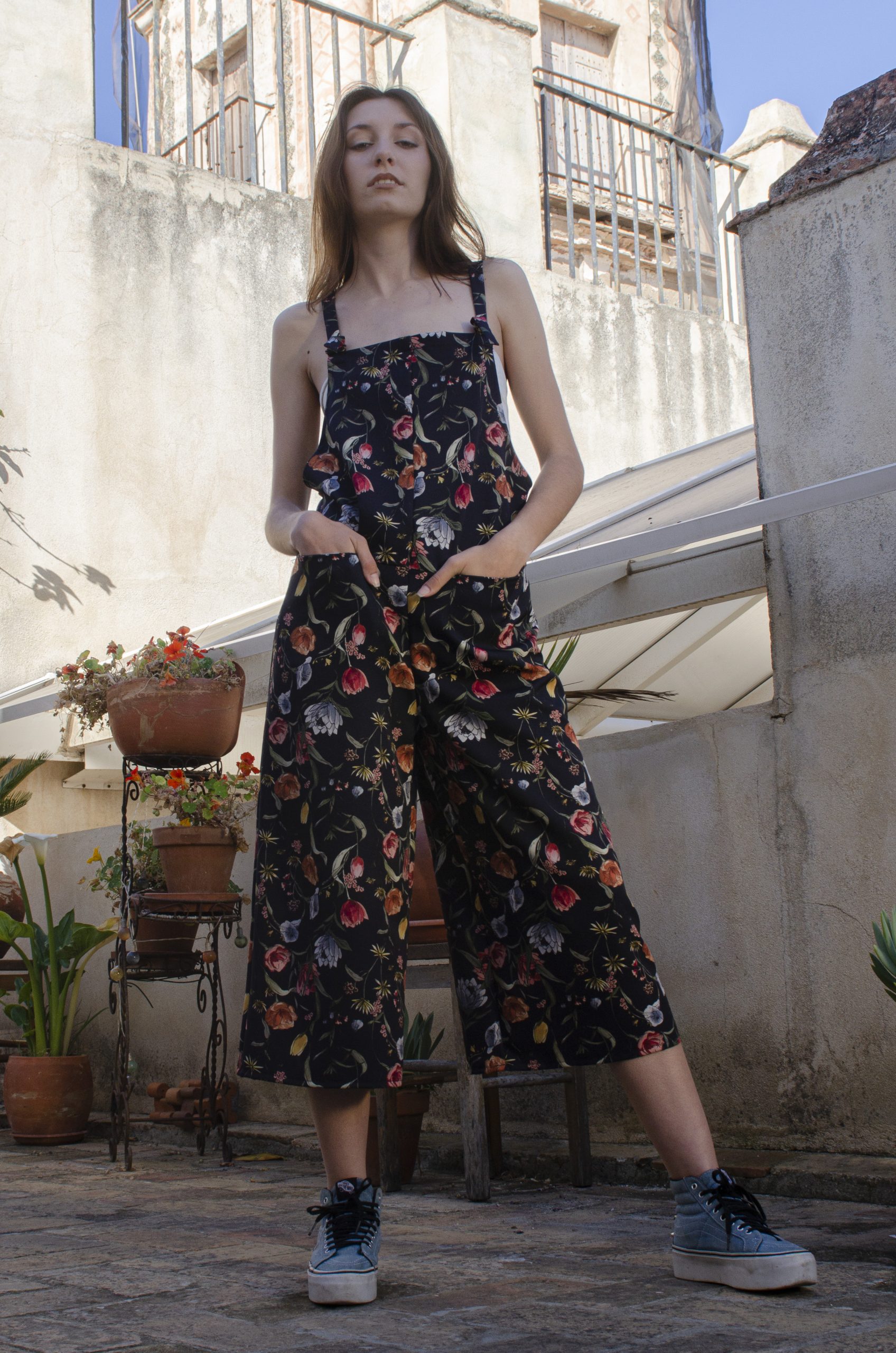 Peto en crepe bioelástico con estampado de flores sobre fondo azul marino. Bolsillos invisibles en el delantero y de parche en la espalda. Tacto súper agradable. Tirantes ajustables con hebilla. Lo mejor: ¡no se arruga!