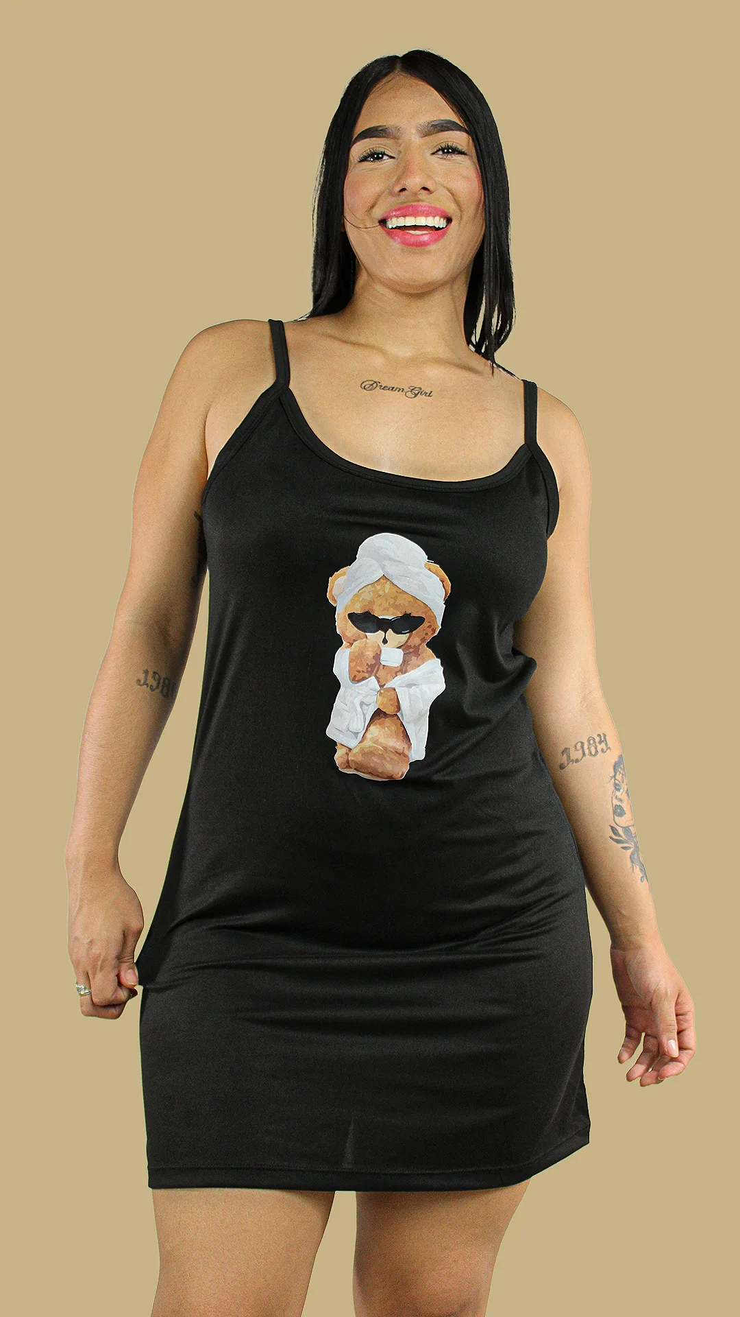 El color negro clásico le otorga a la pijama un toque elegante y moderno, mientras que el adorable aplique de oso añade una dosis de diversión y ternura. El osito con gafas de sol y bata es un diseño que destaca por su originalidad, convirtiéndola en una prenda única para relajarte con estilo.