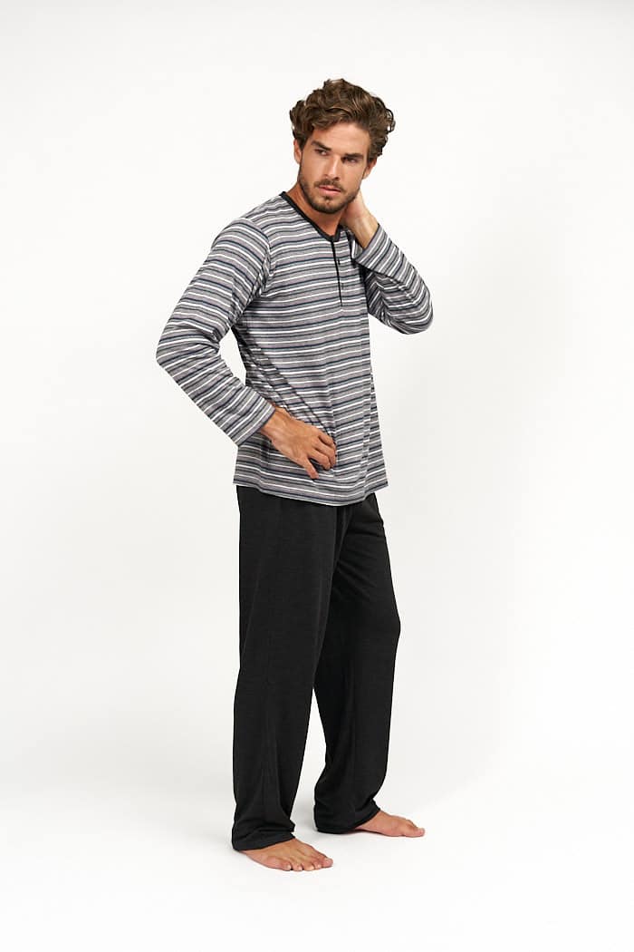Pijama de 85 % algodón 15 % poliéster combinado rayas grises para entretiempo, una prenda perfecta para estar más que cómodo en casa.