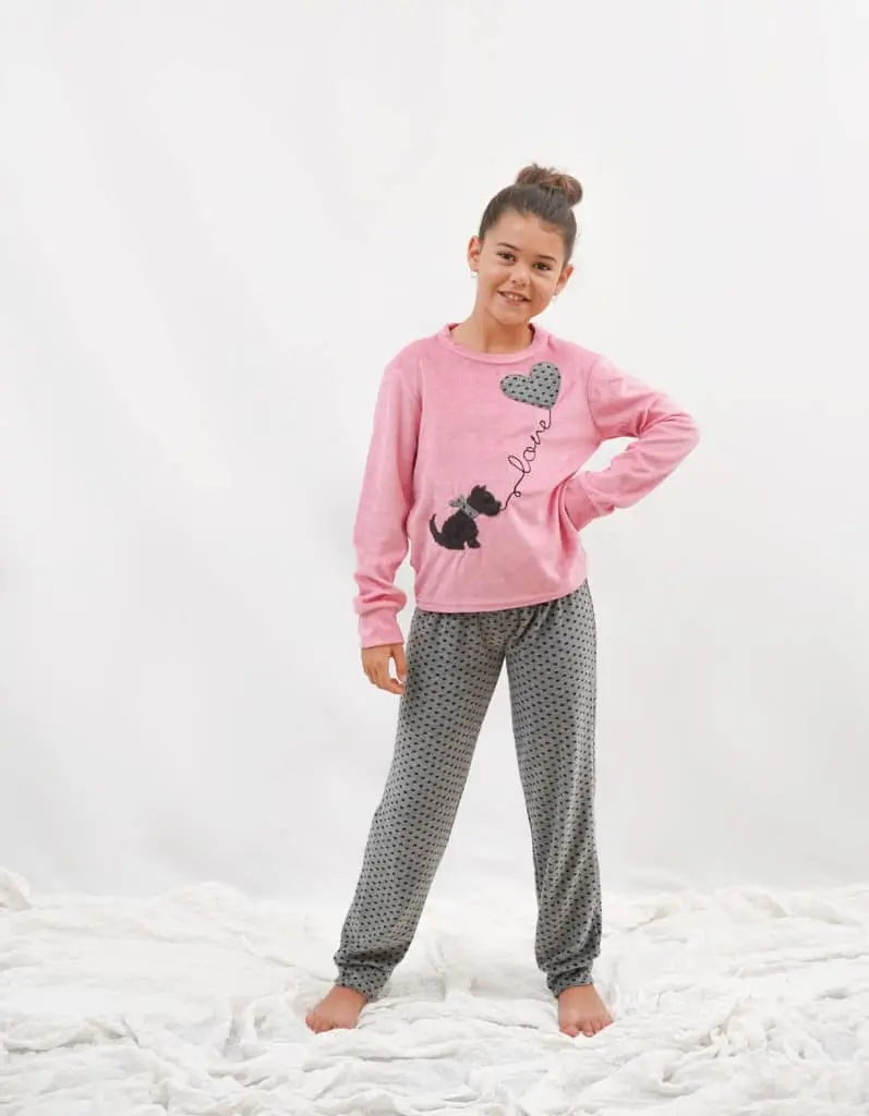 Pijama de niña de terciopelo color rosa, un diseño delicado y muy femenino. Compuesto de materiales de alta calidad 80% algodón y 20% poliéster.