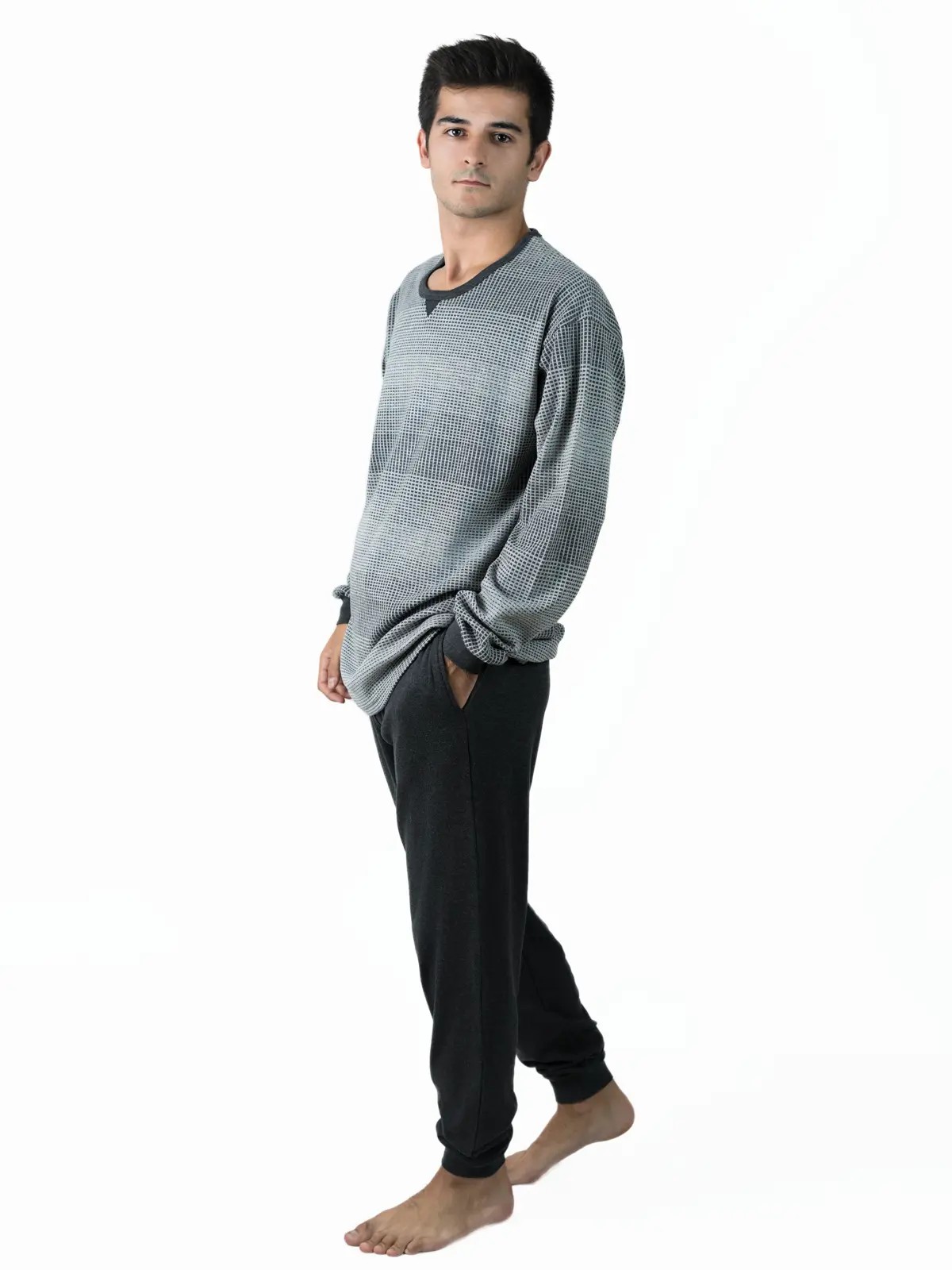 - Puños en la Camisa y Pantalón: La camisa presenta puños que añaden un ajuste cómodo y un acabado pulido. El pantalón también cuenta con puños, proporcionando un ajuste seguro y evitando que se suba mientras duermes.