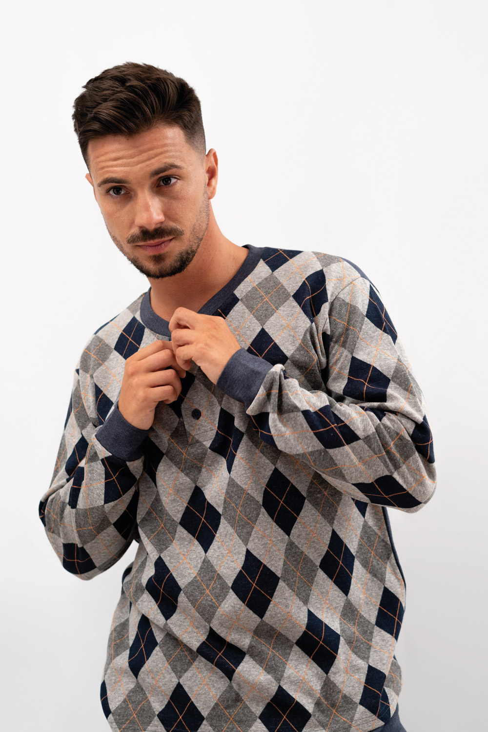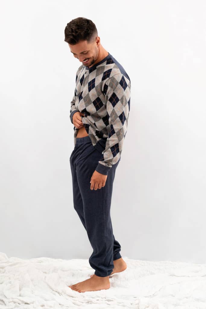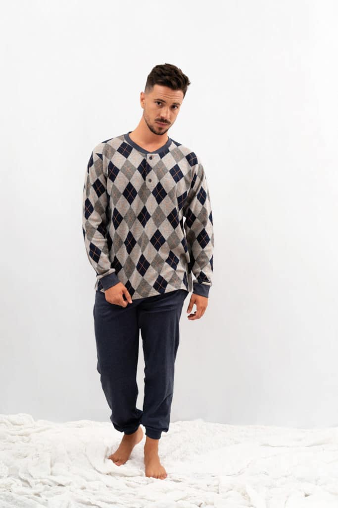 Pijama para hombre de invierno con rombos en Jacquard, una prenda sencilla y tradicional. Compuesto de 80% algodón 20% poliéster.