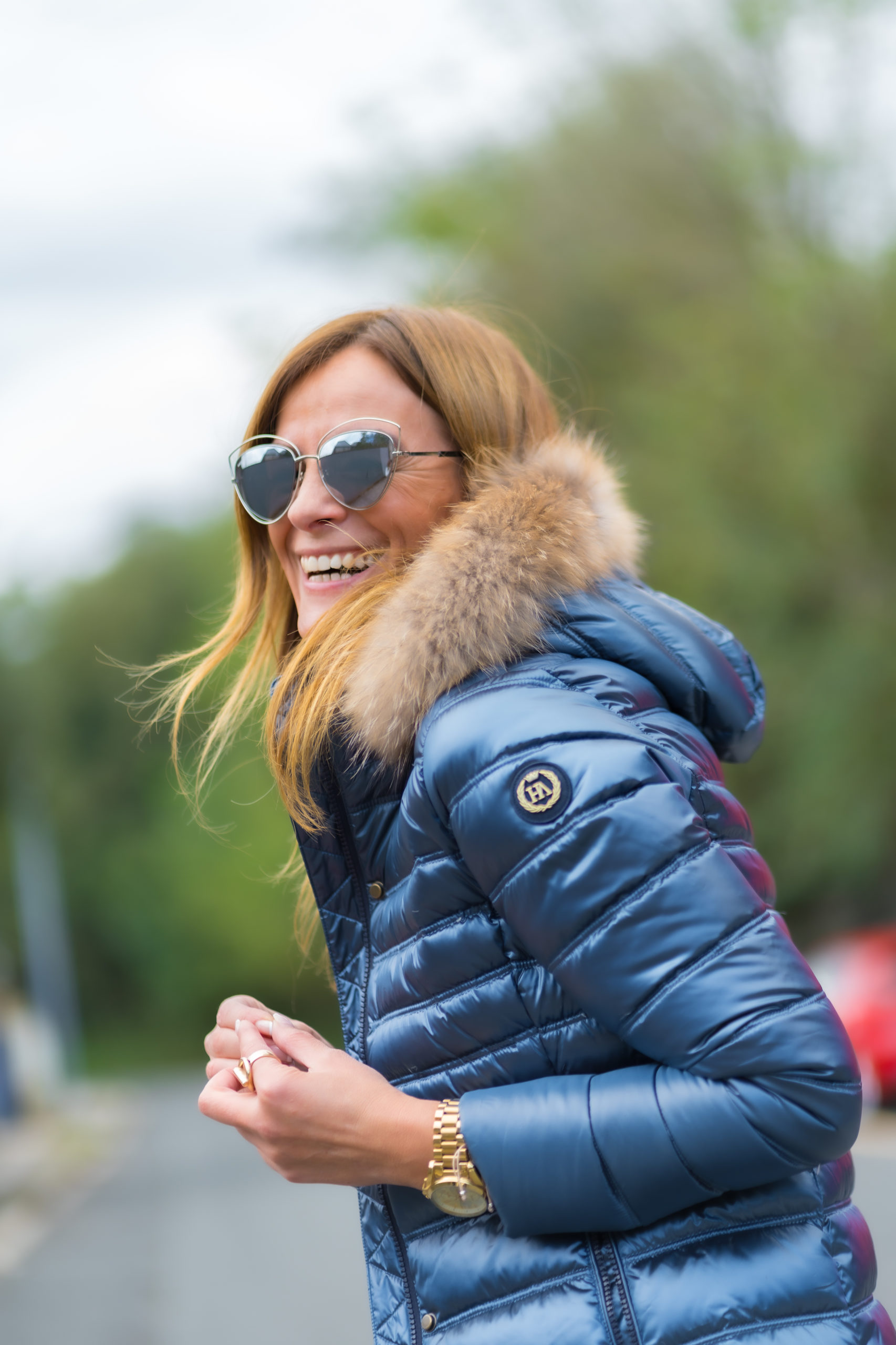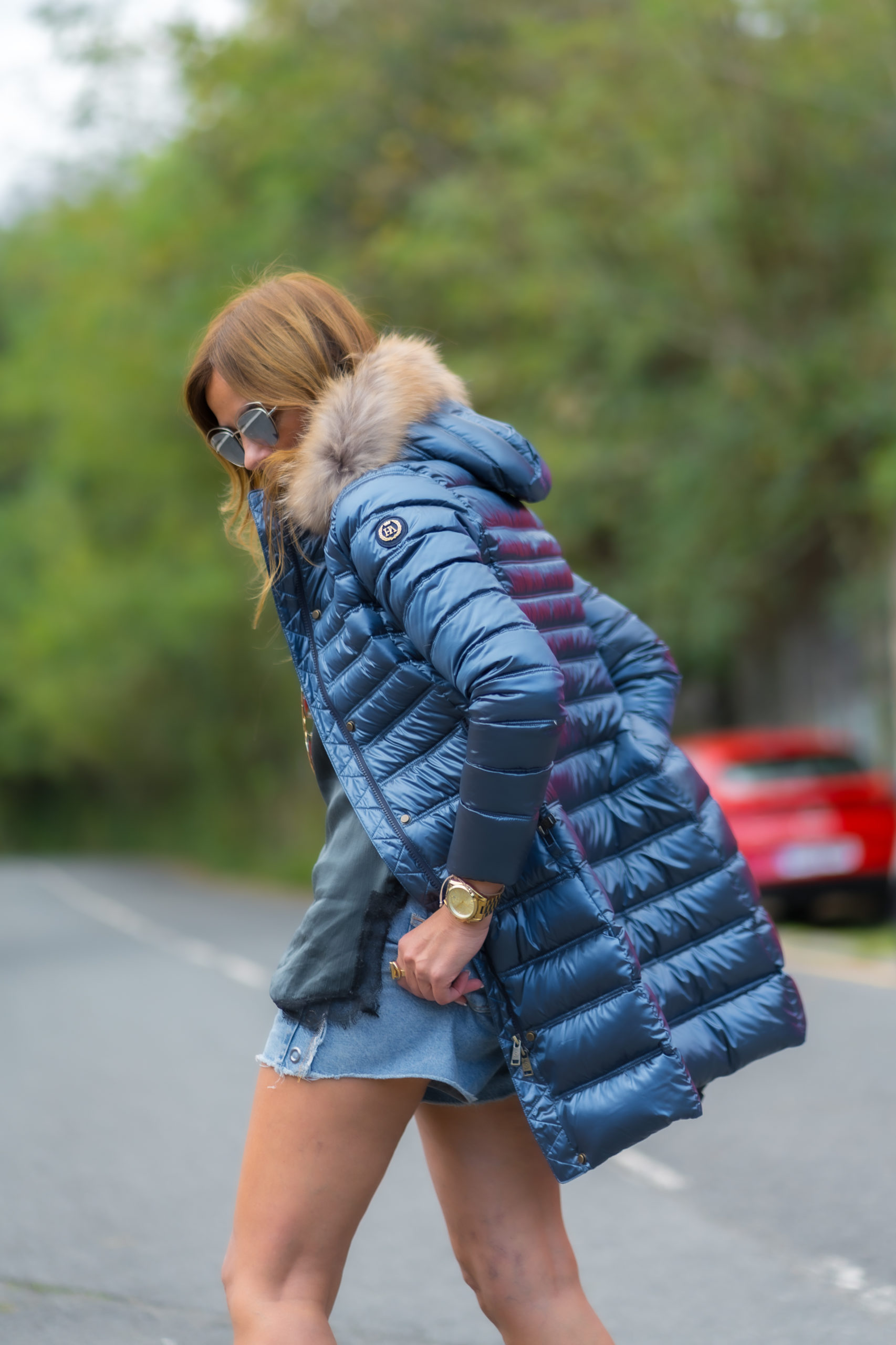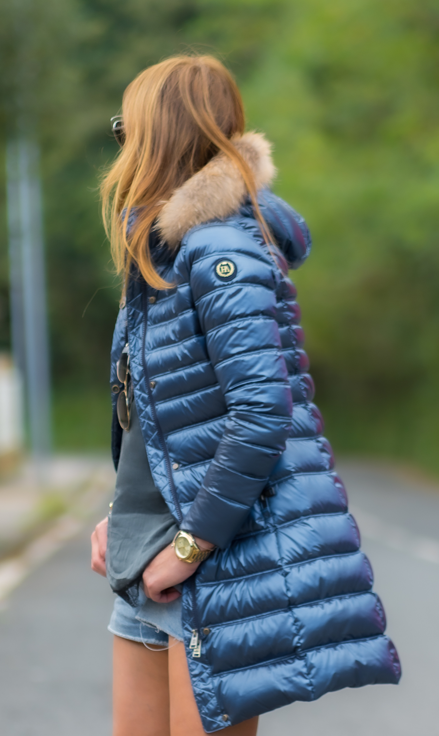 Plumífero Largo de color azul zafiro con acabado brillante. Tiene una preciosa capucha de pelo en color natural desmontable.