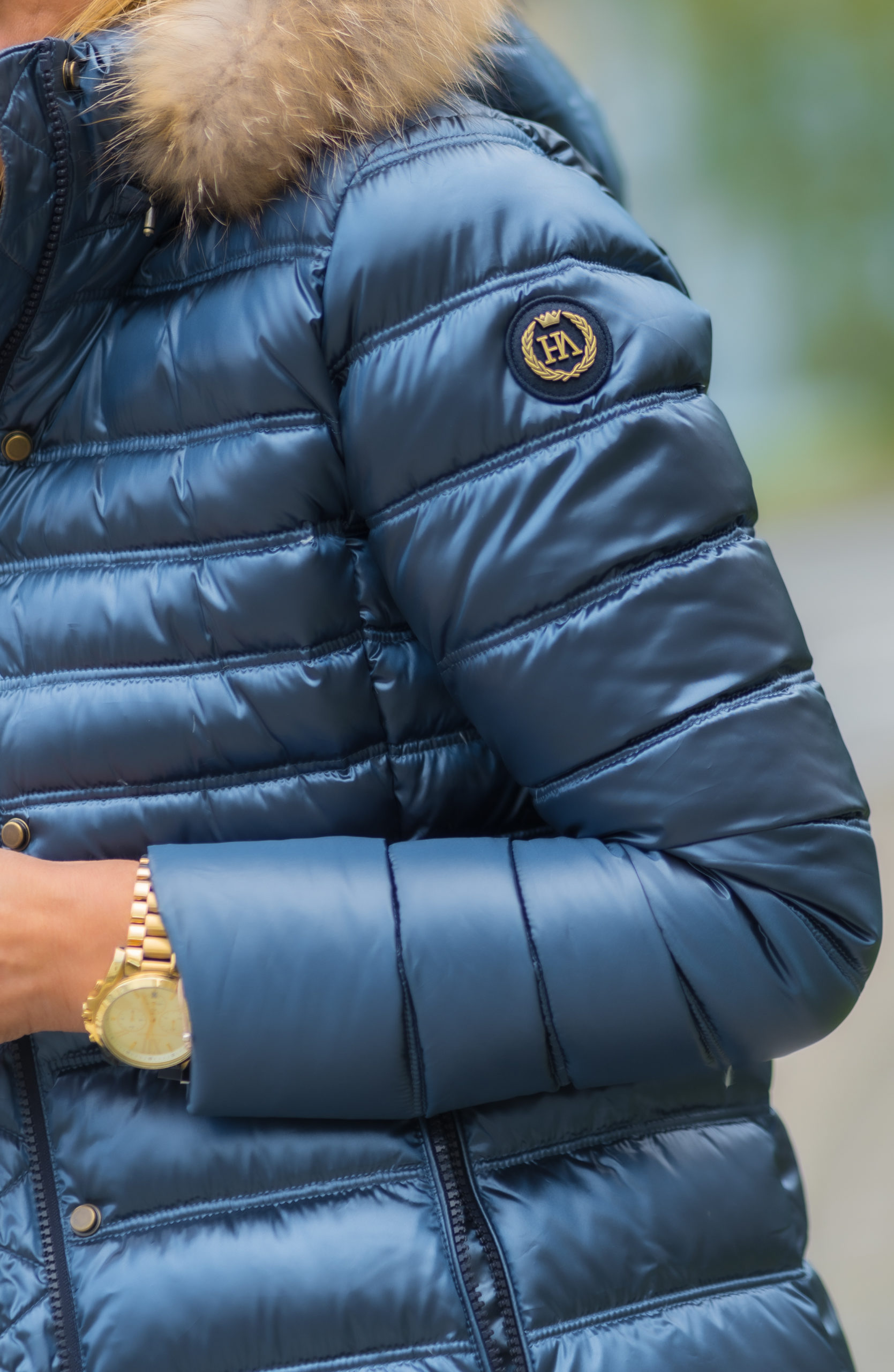 La parte exterior, Satinado con un toque de brillo que hace del plumífero una prenda especial y elegante. En la manga derecha tiene un pequeño detalle dorado mate de la marca Henry Arroway.
