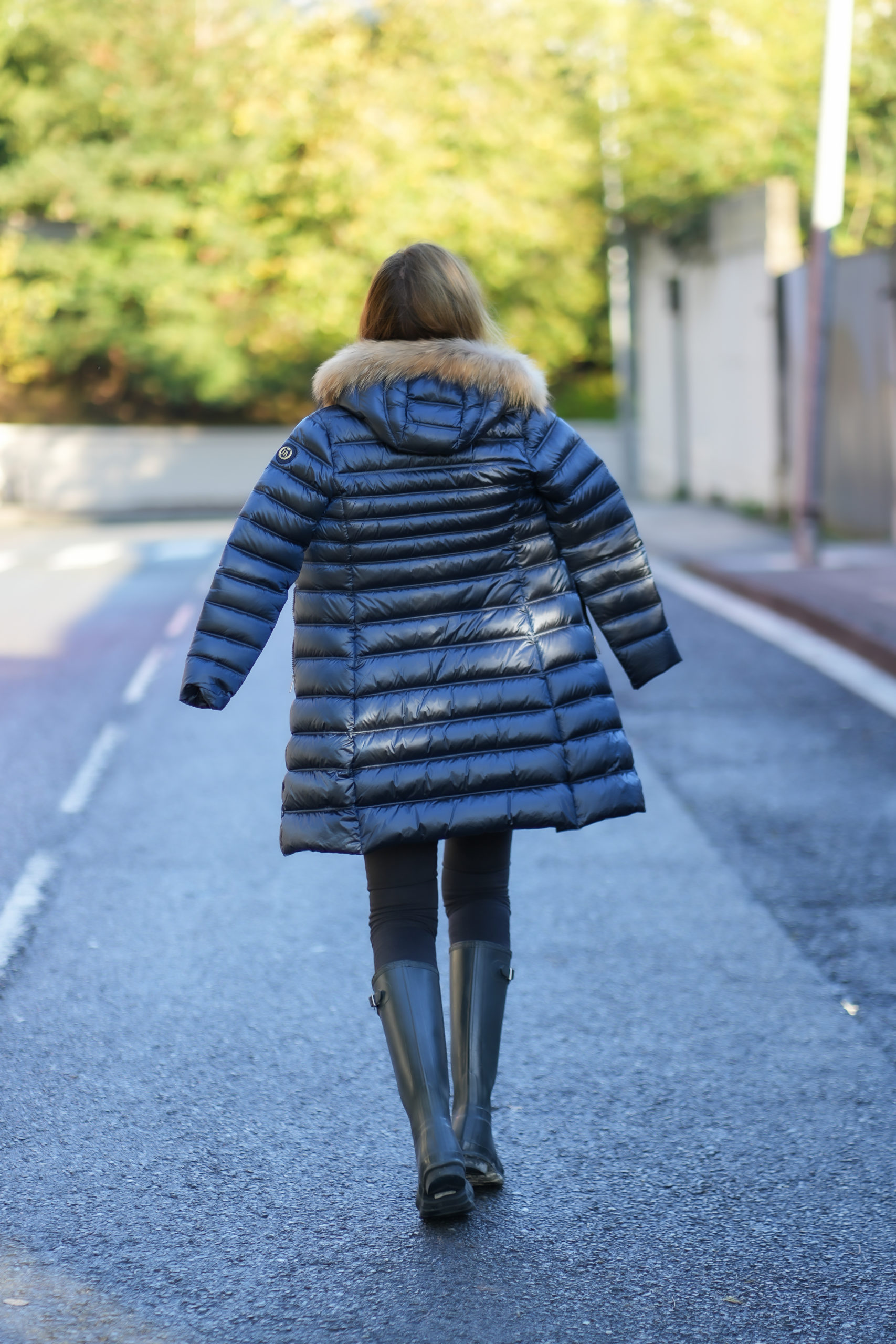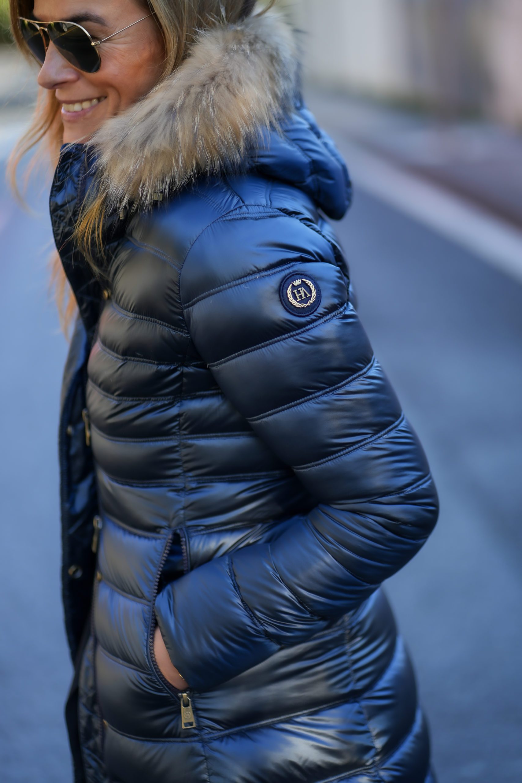 Plumífero Largo de color azul zafiro con acabado brillante. Tiene una preciosa capucha de pelo en color natural desmontable.