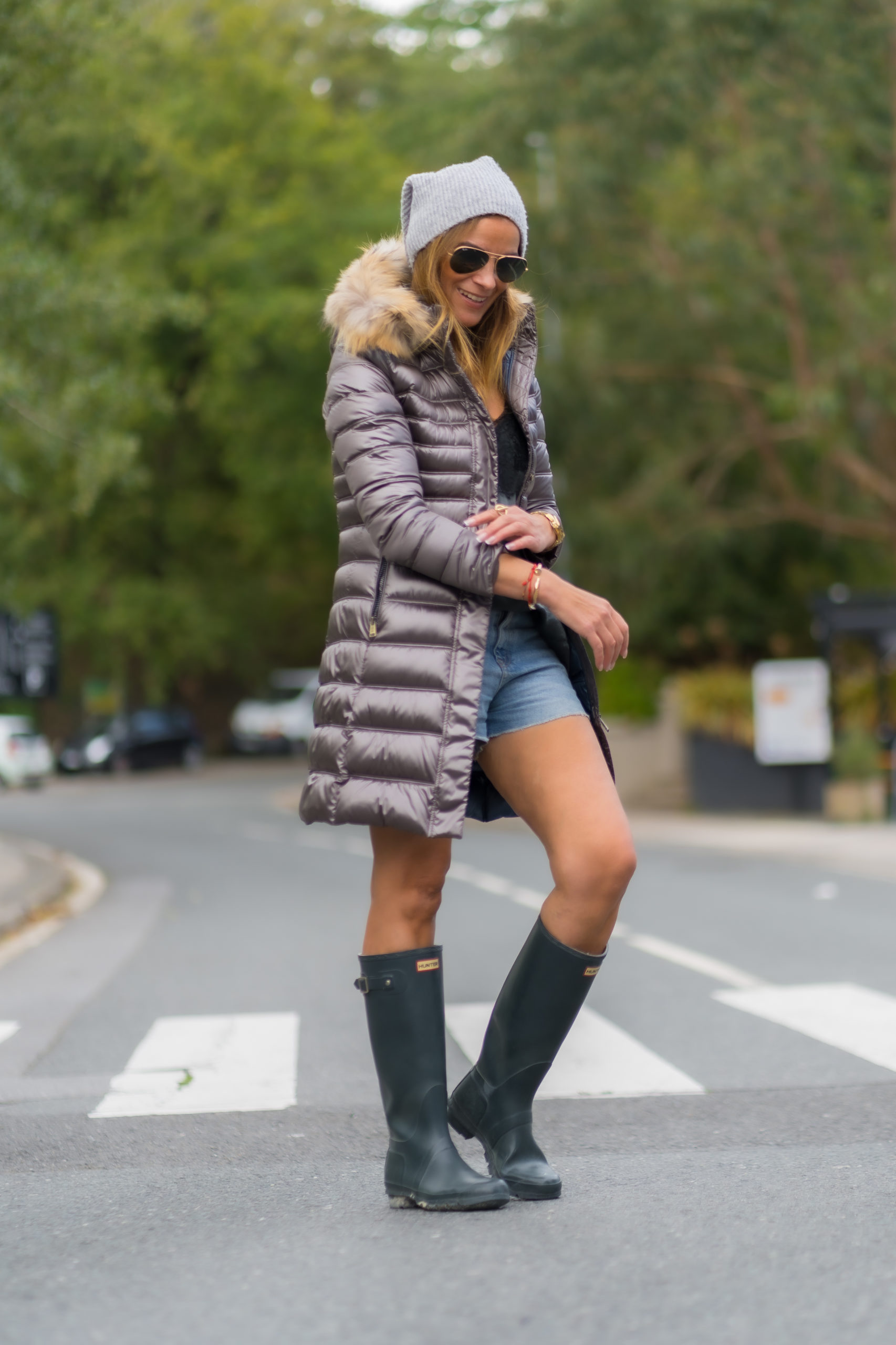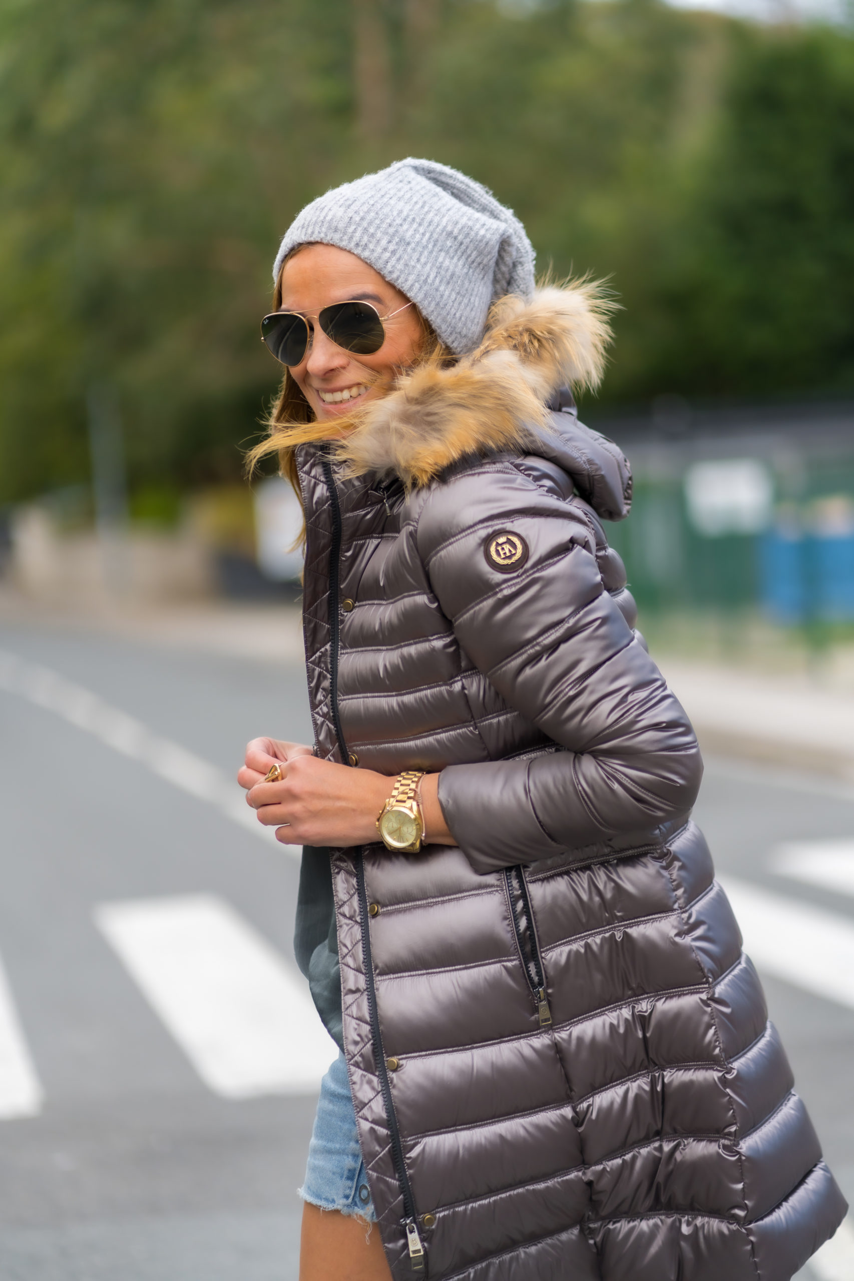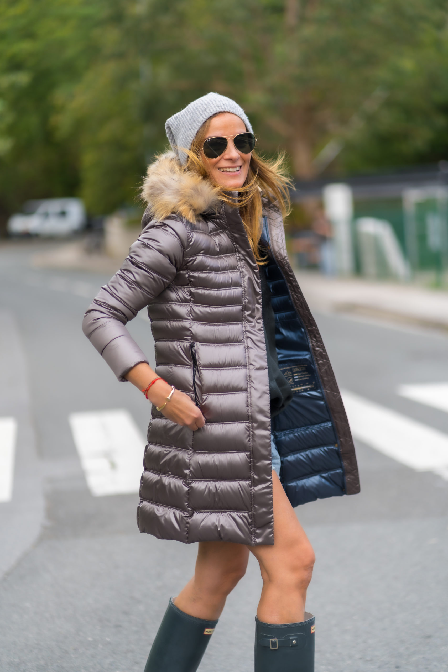 Plumífero Largo de color Taupe con acabado brillante. Tiene una preciosa capucha de pelo en color natural desmontable.