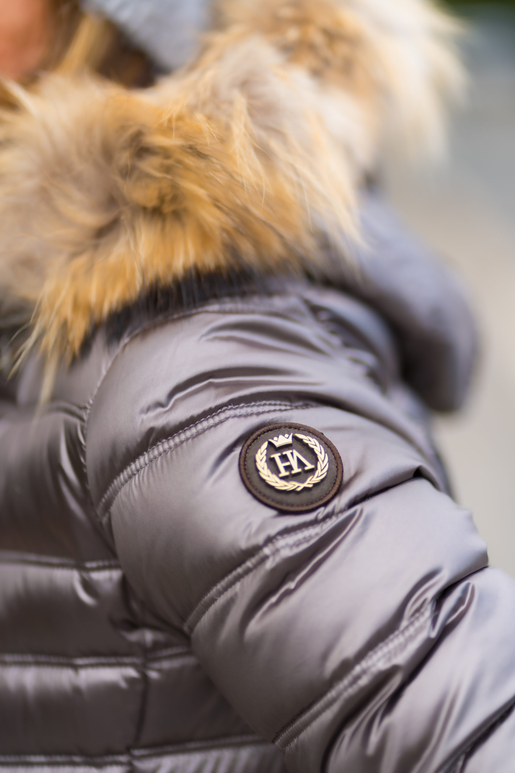 La parte exterior, Satinado con un toque de brillo que hace del plumífero una prenda especial y elegante. En la manga derecha tiene un pequeño detalle dorado mate de la marca Henry Arroway.